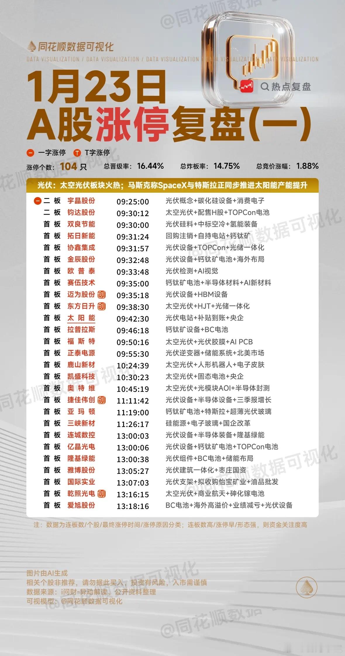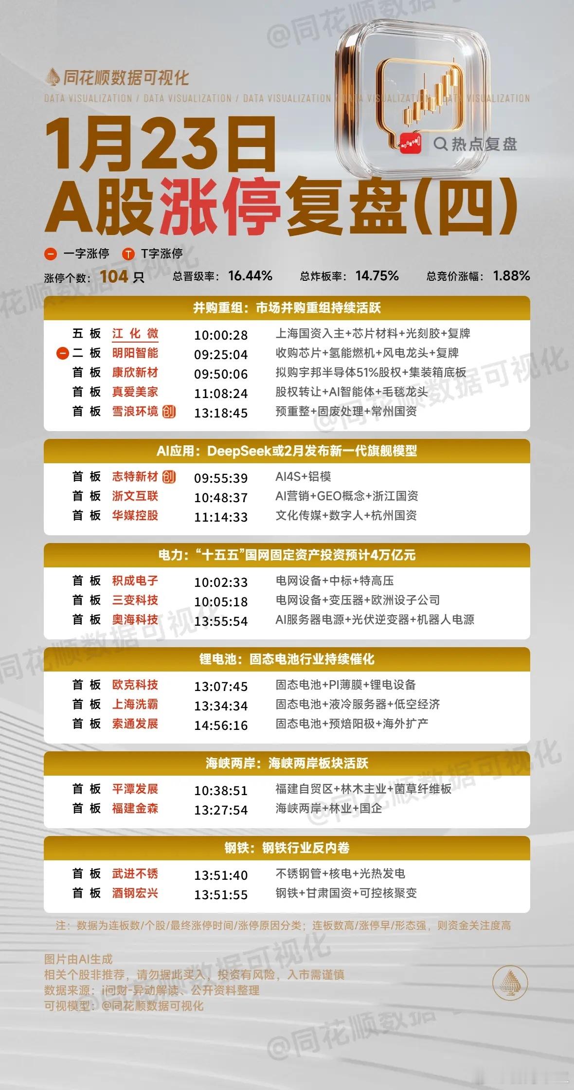 1月25日复盘:巨力索具、中超控股等五股隔日走势研判本文仅为交流分享,不构成投资建议,股市有风险,投资需谨慎。巨力索具(商业航天)周五竞价未开一字,但开盘快速分歧转一致封板,全程无大抛压,走出强势缩量连板,助力商业航天板块延续高潮。3日龙虎榜显示,紫阳东路、吴中大道等活跃游资为主买,东亚苏州分止盈离场,其余抛压有限,属良性换手榜单。作为商业航天唯一身位龙头,该股3连板持续缩量,资金一致性极强,隔日预期一字板,若未开一字,预示板块将现巨大分歧,资金或兑现下杀;但作为板块龙头,下杀大概率有强支撑,或走出放量承接的连板形态。其隔日竞价表现,可作为商业航天板块持续性的核心风向标。中超控股(商业航天)连续两字板为板块独一份,是带动商业航天走高潮的核心标的之一。周五连板量能较首板明显放大,存在分歧抛盘,隔日开板为大概率事件,竞价难续涨停价,开盘后的资金承接力度及能否回封为核心看点。若巨力索具开盘表现强势,将对其形成正向反哺;若板块开盘分歧加剧,该股抛压将显著增大,接力性价比低于巨力索具,板块分歧阶段若非整体分歧程度较轻,其分歧节点并非买点。航天电子(商业航天)作为商业航天最早修复的趋势股、板块趋势中军,周四冲高回落后,周五小幅高开顶住分歧趋势向上并封板,虽最终为烂板,但整体形态依旧强势。盘后公司再次发布风险提示,短线情绪或受影响,叠加隔日商业航天板块存在回调预期,该股趁势调整为大概率事件。其开盘能否给出冲高溢价为关键,即便后续趋势下杀,整体支撑也相对较强,调整幅度可作为商业航天板块整体分歧程度的风向标。金风科技(商业航天)因参股的蓝箭航天IPO状态变更为“已问询”,获实质性利好加持,周五高开后强势趋势封板,港股同步跟涨。龙虎榜显示,万豪世家、成都系等游资及1家机构为主买,卖盘抛压整体较小,榜单表现强势。但IPO概念炒作持续性通常较弱,多游资介入反而易引发抛盘,且公司近千亿流通盘偏大,叠加板块隔日分歧预期,需警惕走出开盘即巅峰的走势。近期大盘股难现持续强势,除非板块超预期走强,否则开盘前10分钟的表现,基本能确定其当日走势基调。锋龙股份(并购重组)17连一字板后开板放量,且放量后市场承接强劲,最终走出T字板晋级,斩获逆天18连板,板上震荡后早盘便稳稳封死,分歧后承接力度超预期。龙虎榜显示,思明南路、华泰湖南分等多家游资入场接力,卖盘为获利资金止盈,3日榜亦以游资席位为主,高位出此榜单属加分项。但该股已多次触发停牌预警,周五盘后更被实施暂停部分投资者交易的措施,监管强势态度明确。参考去年天普股份类似监管后,虽短期再涨3板,但随后停牌迎来连续一字跌停,短期属鱼尾行情;而锋龙股份当前位置更高,且周五已放出巨量,不可简单套用天普走势。叠加近期短线市场监管制约严格,该股隔日大概率迎来大分歧,顶涨停资金或显著减少,断板为大概率事件。连续一字板后存在吃独食风险,若再次触发停牌,或将面临巨大风险,从资金情绪角度,断板或为多数资金的预期走势。