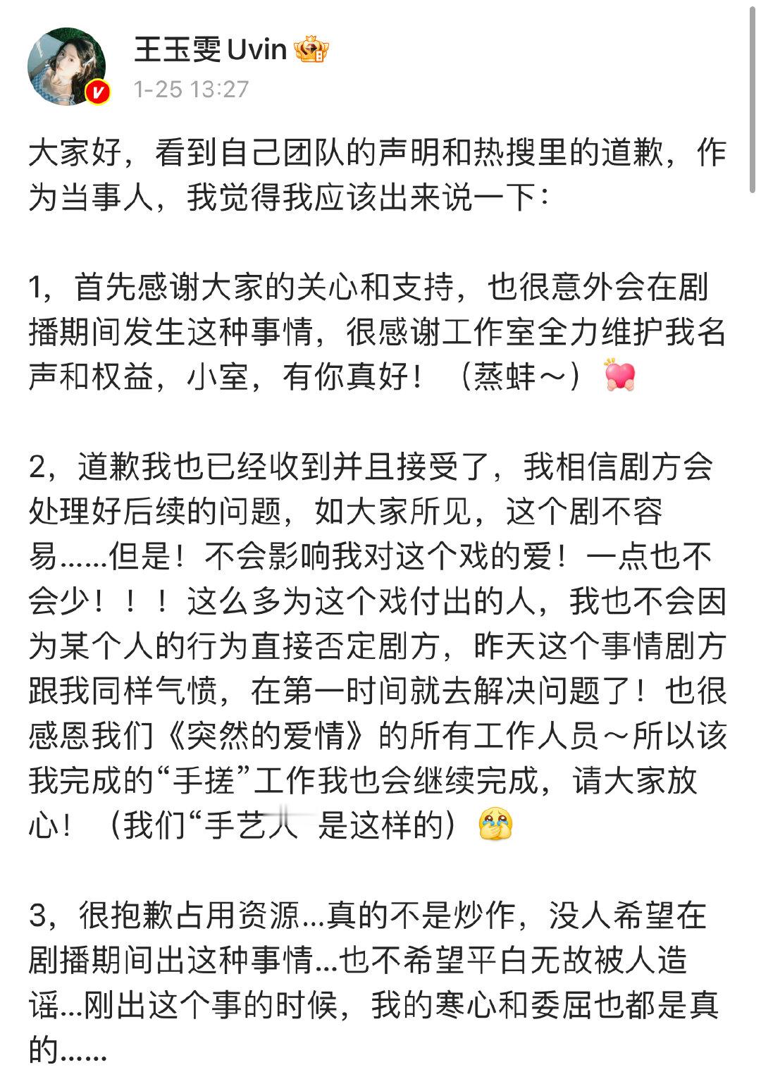 王玉雯否认炒作王玉雯说寒心和委屈都是真的 1月25日,发文回应道歉,表示道歉已经收到并且接受了,相信剧方会处理好后续的问题。并否认此事是炒作,寒心和委屈也都是真的。