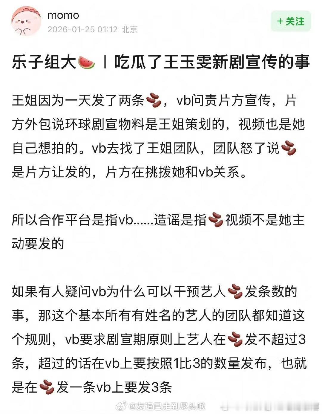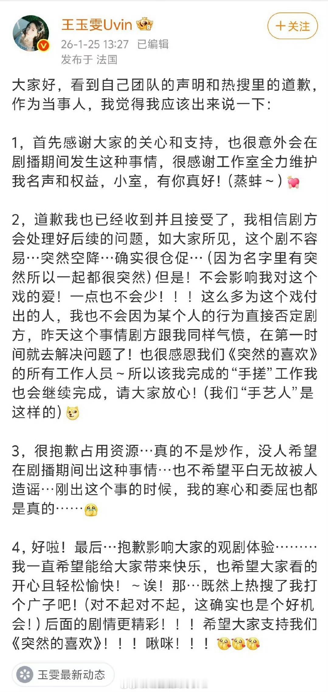 王玉雯发博道歉并否认炒作了事情起因是王玉雯团队和新剧剧宣团队有矛盾,明明私下解决就好,却偏要摆在台面上发博又是声明又是道歉的网友就质疑其是炒作的同时主动暴露围脖的平台规则引发争议 王玉雯方停止突然的喜欢一切宣传工作