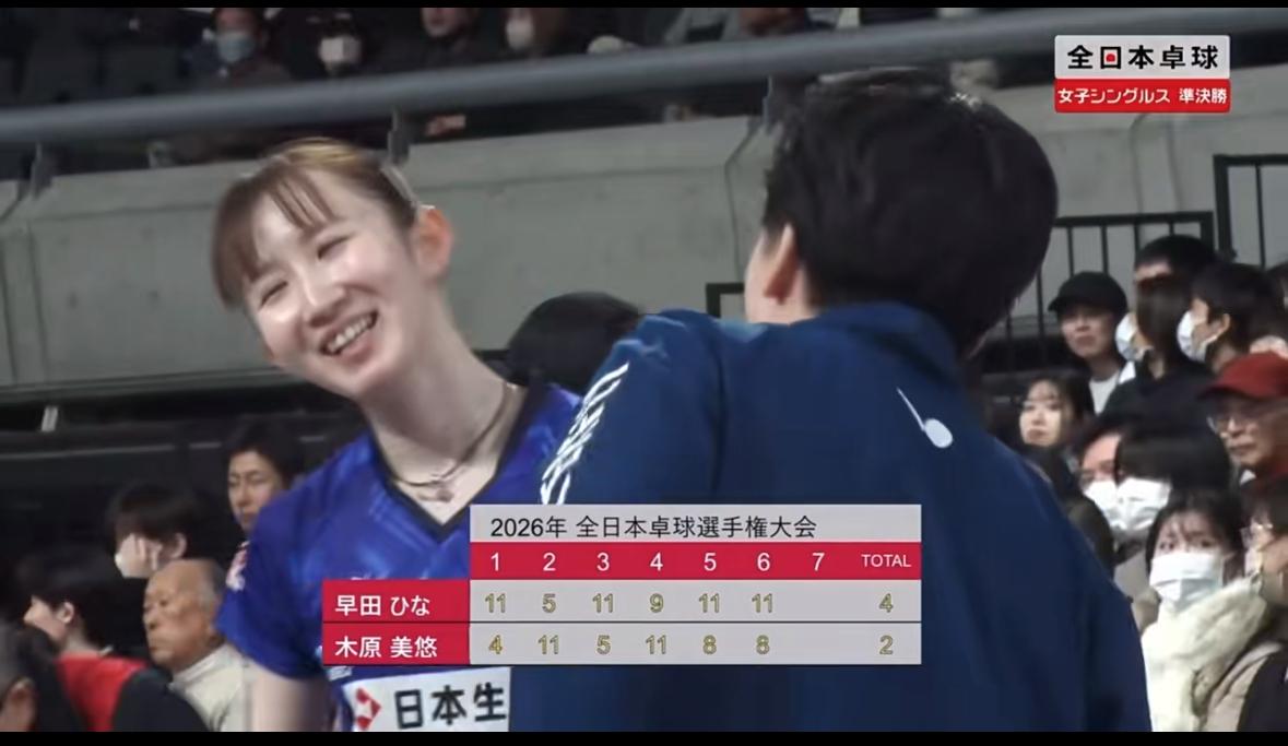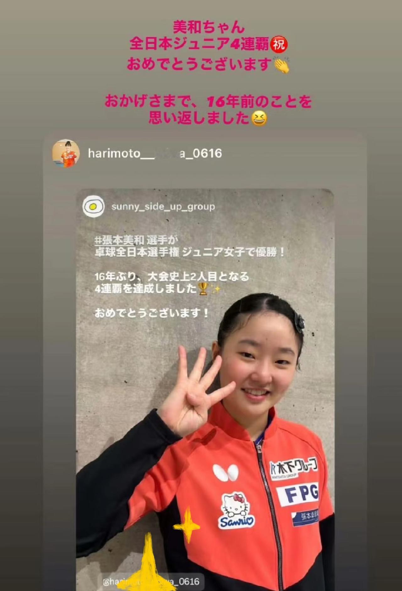 张本美和4:3早田希娜突破自己拿到梦寐以求的全锦赛女单冠军🏆 1月25日全日锦女单决赛中, 张本美和4:3早田希娜,实现了 个人突破,拿到全日锦女单冠军🏆! 张本美和是日乒的新生代小将, 同时拿到全日锦青年组冠军, 也是连续四年蝉联青年组冠军! 去年张本美和二分之差输早田, 今年, 早田连续追张本美和赛点, 第六局张本美和10:6领先, 被早田逆转拿下, 硬把比赛拖到决胜局, 决胜局早田1:8落后, 无力回天, 张本美和夺冠🏆……