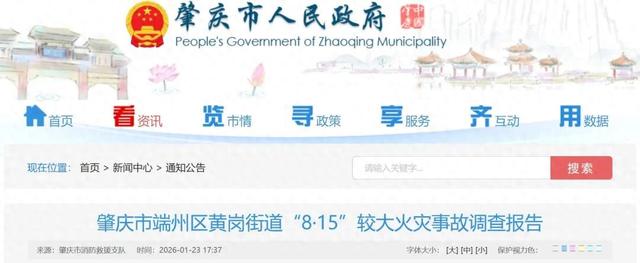 1月23日,广东省肇庆市人民政府公布了《肇庆市端州区黄岗街道“8·15”较大火灾事故调查报告》。