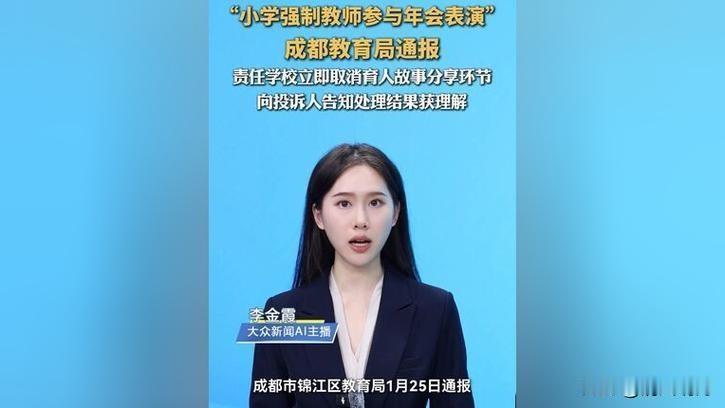 成都一小学被责成取消育儿故事分享! 近日,接群众投诉成都师范附属小学慧源校区存在“强制教师参与年会表演”情况。经核实,该校原计划期末召开学期总结会,拟在育人故事分享环节组织教师进行多种形式展示交流。 区教育局表示,已取消育人故事分享环节,并向投诉人告知处理结果获理解。 然而,这起事件背后折射出的是当下教育生态中一些令人深思的现象:教师的自主权何在?在应对压力与期待的夹缝中,教师们的声音似乎越来越被边缘化。 从表面看,这不过是一场普通的年会活动,但细细品味,却令人心生疑问:为什么“育人故事分享”会成为“强制”内容?难道教师的专业成长和教学热情,只能通过“表演”来体现? 这背后反映的是某些学校在追求形式主义的同时,忽视了教师个体的尊严和自主性。 更令人忧心的是,事件中展现的管理方式——“强制参与”——让人不禁质疑:我们真正关心的是教师的成长,还是只想用表演来“装点门面”?教师应是引领学生成长的引路人,而不是被动的表演者。 这样的“强制”只会让教师心生抵触,影响教学热情,也削弱了学校应有的凝聚力。 这起事件提醒我们,教育的本质是尊重与理解。只有给予教师更多自主空间,才能激发他们的创造力和热情,真正实现育人的初心。 希望未来的教育管理,不再用“强制”来绑架教师,而是用理解和支持,点燃他们心中的火焰。毕竟,教育的力量,源自每一位教师的真诚与热爱。