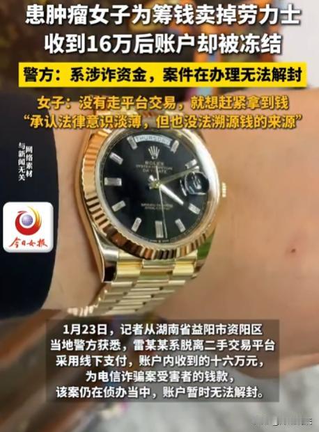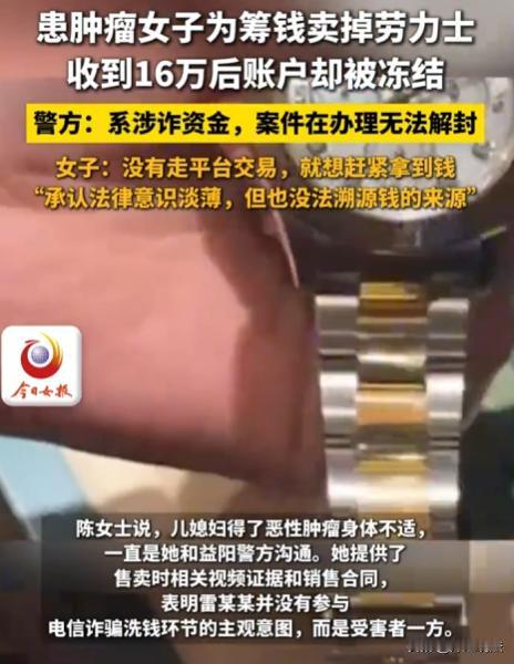 陕西西安,陈女士为给患癌儿媳治病,将家中劳力士手表挂二手平台售卖。一买家以16.4万谈好价格,打款时称银行下班,走平台不便,要求私下转账。陈女士没多想就同意了,钱很快到账。可第二天陈女士发现账户被冻结,原来这笔钱是湖南益阳电信诈骗案的赃款。陈女士委屈称自己也是受害者,不该为这买单。 据大风新闻、浪涨新闻等报道,西安的陈女士一家遭遇大难题,儿媳雷女士十年前患甲状腺癌,今年癌细胞又转移到肺部。小两口开的烧烤店一直亏损,治病钱都没着落。 无奈之下,10月21日,他们决定卖掉家里最值钱的劳力士手表。 雷女士躺在病床上,脸色苍白,化疗让她的头发掉了不少。她看着丈夫愁眉不脸的样子,轻声说,把那块劳力士表卖了吧,那是家里最值钱的东西了。丈夫沉默了一会儿,点了点头。 他们联系了二手钟表公司,很快验表师就上门了。验表师穿着整齐的工作服,戴着白手套,拿着专业的工具,对那块劳力士表进行了仔细的检查。他一会儿看看表盘,一会儿听听机芯的声音,还用手电筒照着表身查看细节。 经过一番检查和商讨,最终谈好16.4万的价格。雷女士和丈夫心里稍微松了口气,觉得这笔钱至少能缓解一下目前的困境。 到了打款的时候,对方却说公司对公账户下班了,个人转账快,还出示了营业执照。 雷女士和丈夫没多想,觉得人家都出示营业执照了,应该没问题。而且他们急着用钱给雷女士治病,就同意了对方的要求。 很快,钱就到账了,雷女士看着手机上的到账信息,心里稍微踏实了一些。 可第二天,雷女士去银行取钱准备交住院费的时候,却发现账户被冻结了。她一下子慌了神,赶紧问银行工作人员怎么回事。 工作人员告诉她,这笔钱涉及一起案件,需要警方调查清楚才能解冻。 雷女士赶紧联系民警,民警告诉她,这笔16.4万是湖南益阳电信诈骗案的赃款,现在属于涉案资金,得等案件查清确认无关才能解冻。 雷女士一听,急得大哭起来,她哭着说,我们也是受害者,我们只是想卖表给儿媳治病,怎么会摊上这种事。 民警也很无奈,他们说这是按照刑事诉讼法的规定办事,在法定期限内账户会持续冻结。 雷女士和丈夫回到家,把事情告诉了陈女士。陈女士一听,也瘫坐在地上,她没想到卖个表会惹出这么大的麻烦。 陈女士说,我们只是想救儿媳的命,我们有什么错。他们一家陷入了绝望之中,雷女士的病情不能等,可钱又取不出来。他们不知道该怎么办才好,只能每天以泪洗面。 有人说,这家人太可怜了,本是正常卖表救人,却摊上这事,他们也太不小心了,怎么能轻易相信别人私下转账呢。 从买家的角度来看,他们或许认为私下转账更快捷方便,能尽快完成交易拿到手表。而且他们出示了营业执照,在一定程度上取得了陈女士一家的信任。 但他们没有考虑到这种私下转账可能存在的风险,也没有意识到自己的行为会给陈女士一家带来如此大的麻烦。 而陈女士一家一心只想尽快拿到钱给儿媳治病,没有对买家的要求进行深入的思考和核实。虽然他们的出发点是好的,但这种轻信他人的行为确实存在一定的过错。他们以为只要钱到账了,交易就完成了,却没有想到这背后可能隐藏着巨大的风险。 雷女士家私下接受转账的行为存在过错,虽然从表面上看,他们符合善意取得的部分条件,比如不知道这笔钱是赃款,以合理的价格转让手表等。 但由于手表已经失踪,他们可能面临表钱两空的局面。一旦账户解冻后,他们可能无法追回手表,也无法保留这笔钱。 在这种情况下,他们只能向造成他们损失的责任人索赔。这也提醒我们,在进行贵重物品交易时,一定要走正规平台的担保流程,这样才能最大程度地保障自己的权益。 从法律层面来看,警方按照刑事诉讼法的规定冻结账户是有依据的。因为这16.4万是赃款,属于涉案资金,在案件查清之前,必须冻结以确保案件的顺利侦破。 雷女士家私下转账这一行为确实存在过错。虽然他们看似符合善意取得的部分条件,比如他们不知道这笔钱是赃款,是正常交易。但现在表也失踪了,他们很可能面临表钱两空的局面。 他们只能向责任人索赔,可这个责任人是谁呢?是那个买表的买家,还是背后操纵电信诈骗的犯罪分子。他们根本不知道该去找谁,只能等待民警的调查结果。 在进行贵重物品交易的时候,一定要走正规渠道。正规平台有担保流程,能保障买卖双方的权益。如果像雷女士家这样私下交易,一旦出现问题,就很难维权。 雷女士家现在每天都在盼着能尽快查清案件,解冻账户。他们希望那笔钱能早日取出来,给雷女士继续治病。 在这个事件中,雷女士家是无辜的受害者,他们只是想救家人的命。而那个买表的买家,很可能是电信诈骗犯罪链条中的一环,他的行为严重损害了他人的利益。 这家人太惨了,本是为了救儿媳的命才卖表,却无端卷入电信诈骗案,成了无辜的受害者。 对此,大家都怎么看呢,是觉得陈女士一家太倒霉,还是认为他们在交易中也有疏忽之处呢,一起来讨论一下吧!