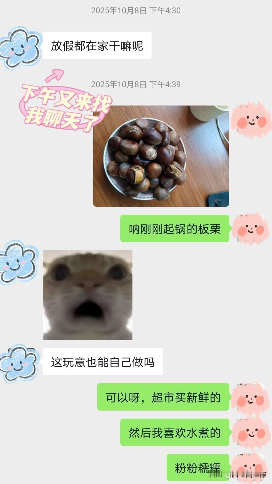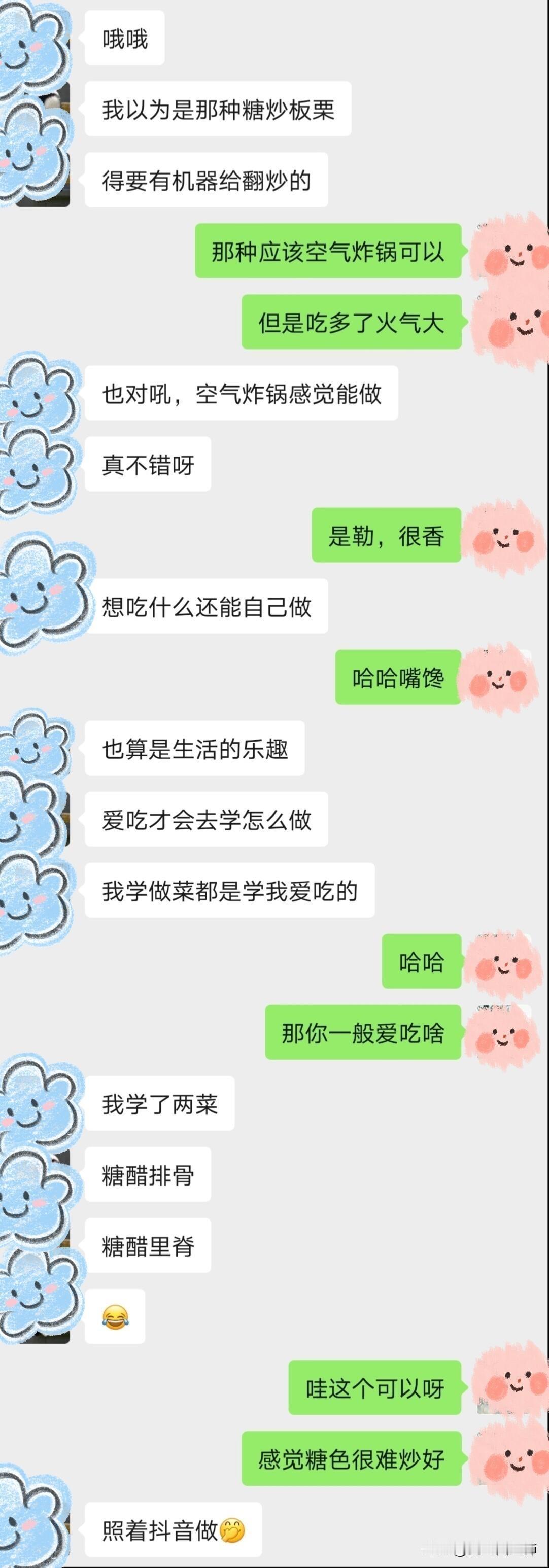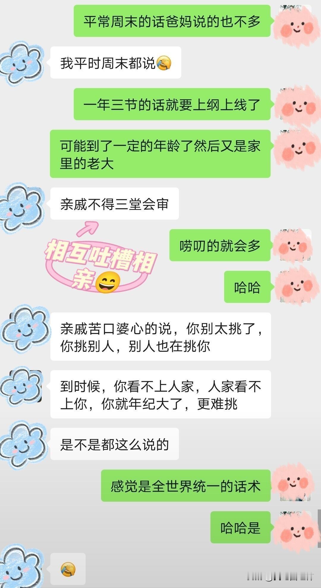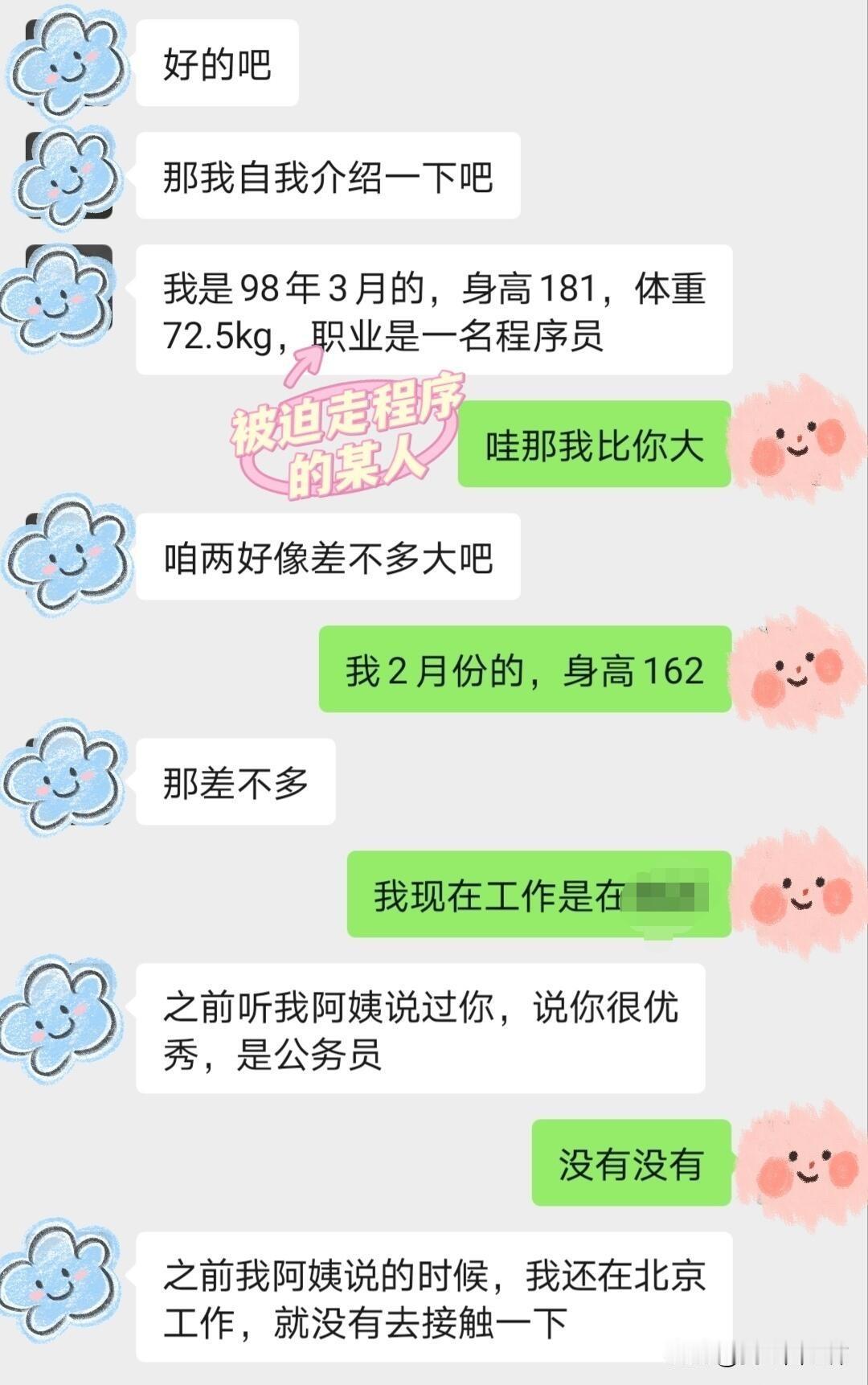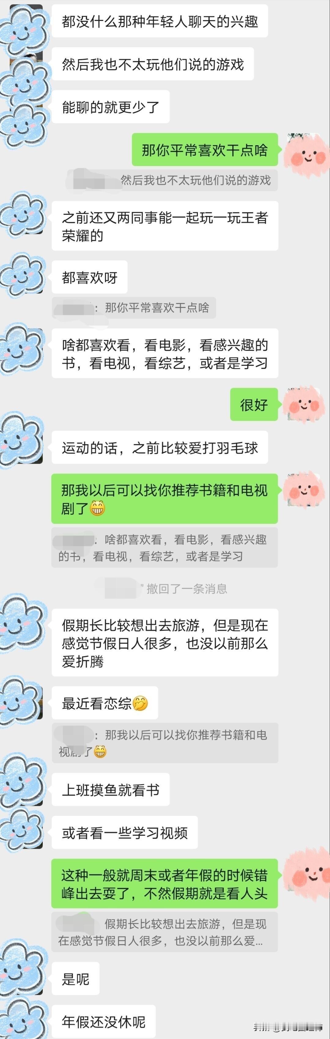 相亲相到正常人了! 面对熟悉的开场白,按照往日剧本应该是先自我介绍—约好时间地点—自动下线,我以为是三分钟版本,结果是接近三小时的文字超长版(涉及各自工作、大学经历、个人喜好等方方面面),并且这超长版非今日限定哦,不同于以往达到自己目的的盘问式输出,虽然也是尬聊,但是双方会反问、回应和分享,基本是想到啥说啥,在相互聊天过程中了解到一些基本信息,这种聊天互动让我觉得很舒适,以至于聊完天后还有一种强烈的不真实感,这是在相亲么😂 如果第一次聊天的时候知道熊师傅是一个那么爱吃瓜的男生,我一定会在他说出“那快跟我说说,你之前加的都怎样”这句话时,给他声情并茂地唠一唠我这些年在相亲届的奇葩经历!可惜我后知后觉!