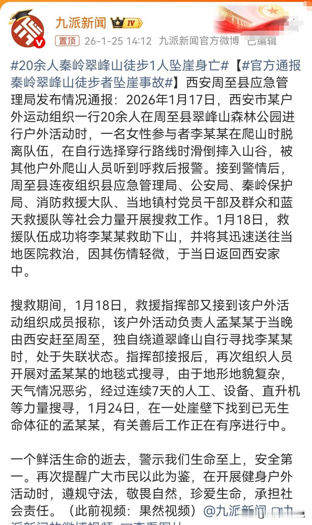 有些人真的太让人无语了。这大冬天的徒什么步呀? 近日秦岭翠峰山,又发生一起因为徒步产生的悲剧。 真搞不懂这些人为什么总是喜欢往危险的地方跑。 其中有一名徒部者坠崖死亡了。 这名死亡的,是这次户外活动的负责人,生前找另外一个坠崖的人,虽然说有责任心,但自己却不幸死亡,被他寻找的那个没生命危险。 千万不要脱离队伍,后果不堪设想。 脱离队伍,没有了别人的照料,那很容易产生风险。
