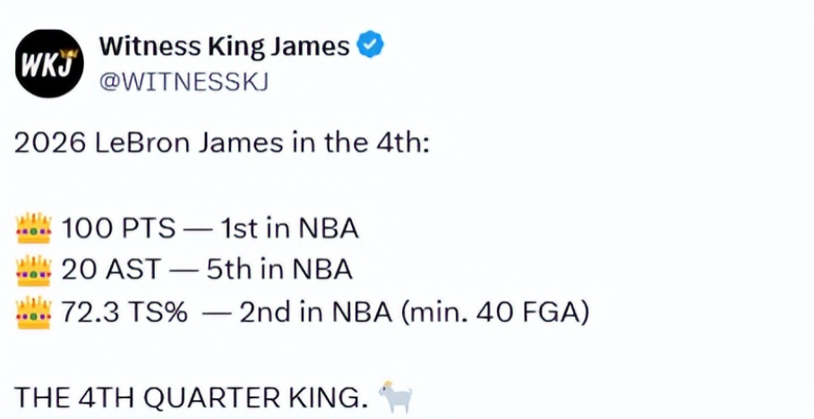 NBA常规赛,湖人客场116-110击败独行侠,本场比赛詹姆斯拿到17分8篮板5助攻。其中,他在第四节单节7中5,得到11分,为湖人最终获胜起到了关键作用。 随后,美媒也晒出了詹姆斯进入2026年后的第四节数据—— 得到100分:全联盟第1 送出20次助攻:全联盟第5 72.3%的真实投篮命中率——全联盟第2(出手数≥40次) 进入2026年后,第四节总得分联盟前五的球员依次是詹姆斯(100分)、马克西(97分)、杜兰特(93分)、米切尔(84分)、字母哥(76分)。 本场比赛的第三节,湖人曾陷入长达近6分钟的得分荒,连续10次进攻回合未能斩获分数。独行侠趁机打出一波16-0的攻击波,一举将比分反超为72-69。湖人主教练JJ・雷迪克在比赛最后9分38秒变阵,换上小个阵容,成为本场比赛的胜负手。在这套阵容登场的这段时间里,湖人净胜独行侠19分,打出一波36-17的进攻冲击波,并最终拿下胜利。 赛后谈到球队在第三节大比分落后,随后在第四节逆转取胜,詹姆斯说:“有时候比赛就是由小高潮所组成的,当然,我们在半场结束时领先13分,他们在第三节打出一波小高潮,对我们取得了大比分领先。第四节一开始,我们仍然有时间去追分,在比赛时间还剩大概6分钟时,我们开始打出一波攻势,最终得以终结了比赛。”
