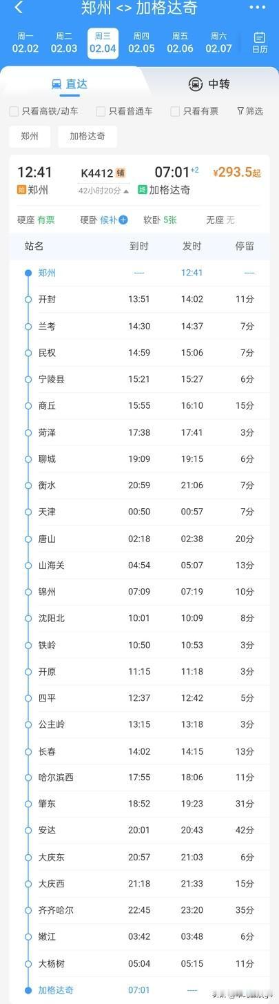 2月2日起,加格达奇至郑州首开快速临客,2月4日起,郑州至加格达奇开行返程列车 2026年2月, 一年一度的春运正式到来, 各地有铁路的地方大都开行春运临时旅客列车, 来提供更多的列车席位供选择和出行。 2026年2月2日, 位于我国东北的大兴安岭地区的加格达奇站, 新增开行至河南郑州方向的快速临客列车, 2月4日起,郑州至加格达奇开行返程列车, 双向车次为k4414和K4412次, 列车为25g型列车,时速120公里, 全程需要39~42小时, 需要从零下30度的加格达奇,驶向零下10度左右的河南,温差也是相距较大。 而这趟列车的好处就是, 不仅提供更多的车票, 而且加格达奇和天津、郑州也能直接坐火车直达, 虽然说路程长了点,需要两天, 但是票价仅需293块,而到中途的哈尔滨,长春,沈阳城市的票价也就更便宜了。 这趟列车你买到票了吗?计划哪天回家呢?