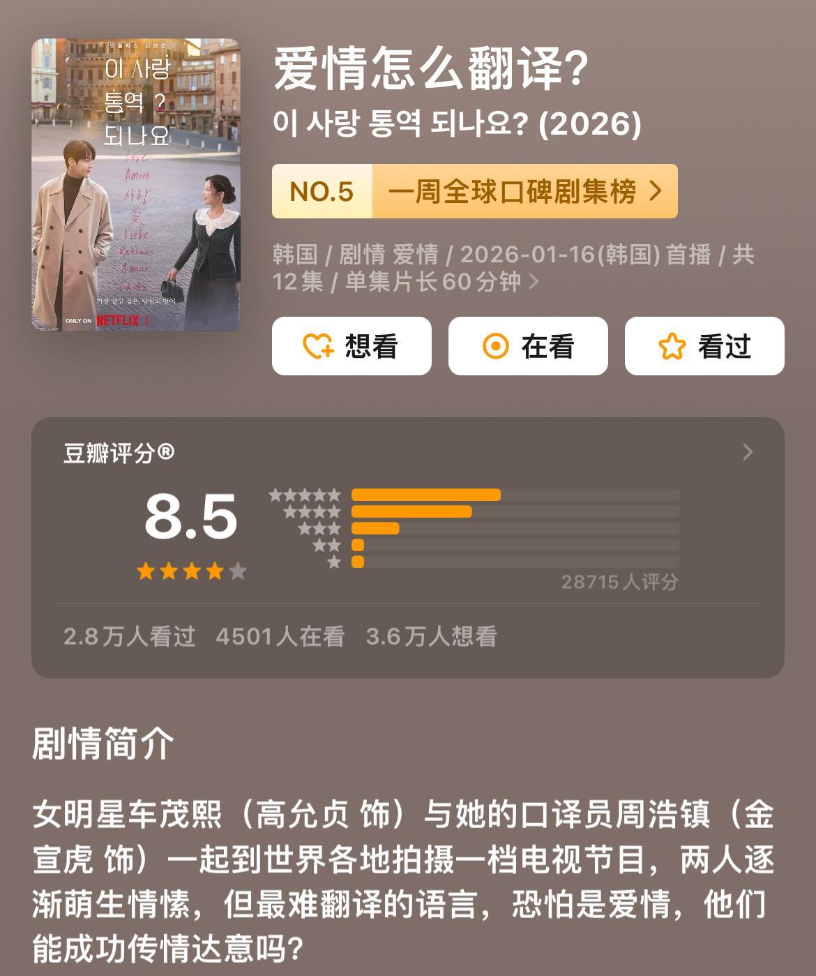 高允真韩剧95大爆花之前对高允真比较有印象应该是《超异能族》,当时豆瓣开分应该有9分,现在是8.9分。这次的《爱情怎么翻译》豆瓣开分8.5,2026开年讨论度口碑都比较好的一部剧。去看了一下她参演的影视作品,好像评分都不错。感觉她资源真的挺好的,演技也不拉胯,估计之后还会有更多爆剧。大家都看《爱情是怎么翻译》了吗?
