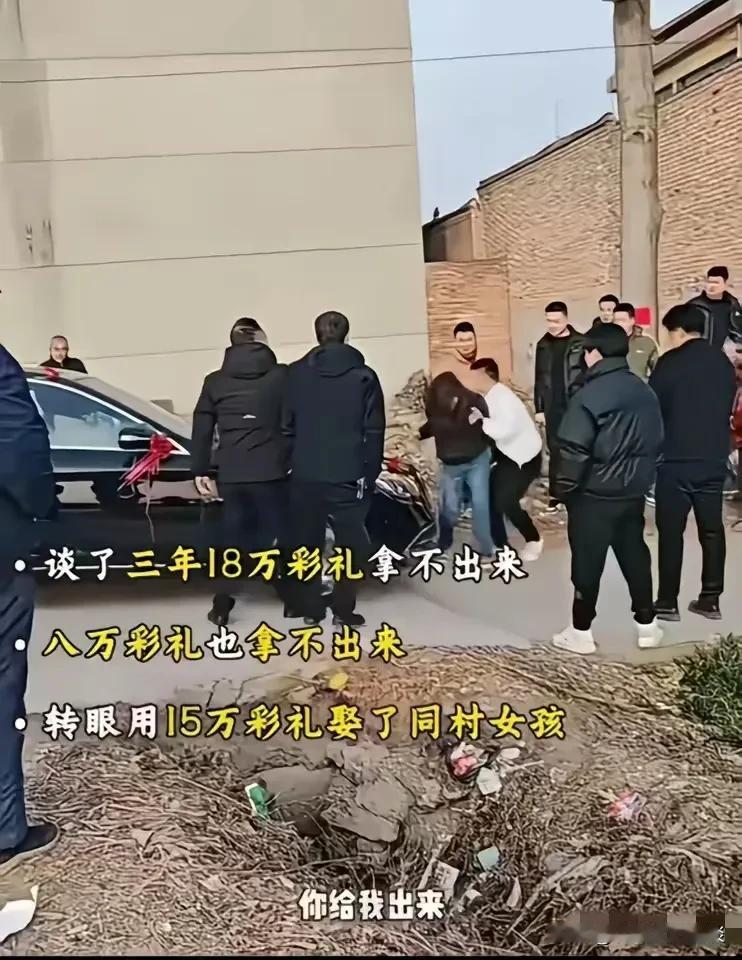 女子闹前男友婚礼现场,喊着三年感情抵不上18万彩礼吗?女子和其男友谈了三年的恋爱,最后他听父母的,要男孩出18万彩礼,少了不行,男孩说15万行不行?女孩说她要听父母的,必须要18万。男孩说那不行,咱们就分手吧。男孩转身用15万娶了同村的女孩。 女子听说前男友结婚了,心里特别不舒服,这谈了三年的男友,将要成为别的女人的老公,他自己闹前男友的婚礼现场。 女子拦着婚车不让走,被其他人拉住,她一直喊,谈了三年,说分就分了,如果真爱她,为什么舍不得出18万彩礼。 网友都说女子太幼稚了,爱情不能用金钱来衡量的。