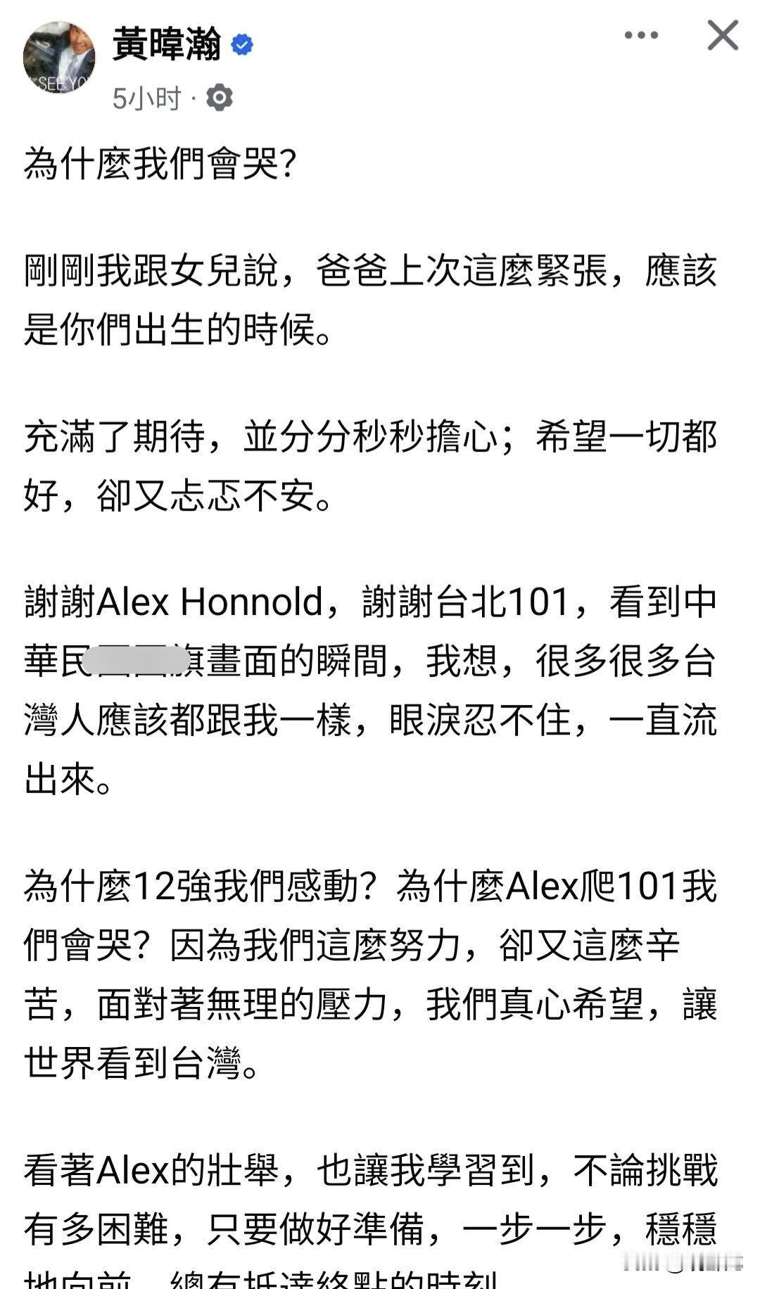 黄暐瀚,你是“爱哭[流泪]鬼”吗? 台湾资深媒体人黄暐瀚今天发文称自己“眼泪忍不住,一直流下来”,这是又哭了。 什么事情让他这样?说起来可能很多人不信,就是今天有个名叫Alex的美国攀岩运动员攀爬了台北101大厦,然后黄暐瀚看直播时心情紧张,充满忐忑,当他看他直播中出现“青白红颜色旗”时突然眼泪绷不住,感动到哭,他还告诉女儿自己上次这么紧张的时刻是在女儿刚出生的时候。 我说黄暐瀚你也太爱哭了吧?这有什么可感动到哭的?让人不理解!要么就是没哭,故意渲染情绪说自己哭了,否则你怎么没有把你哭的照片发出来?我还发现他刻意描述为“为什么我们会哭”?还提到“我想很多很多台湾人都跟我一样,眼泪忍不住,一直流出来”。 谁和你一样哭了?我甚至看了黄暐瀚这篇贴文评论区,没有一个人说自己感动到哭,黄暐瀚这个人真的是奇怪,这点小事就说自己眼泪忍不住哭了,你是“爱哭鬼”吗?去年高市早苗民调75%的时候,郭正亮在李珮瑄节目上说黄暐瀚又感动到哭,当时我还不信,现在来看,真有可能,黄暐瀚要么是真的喜欢哭,要么就是经常告诉别人自己又感动哭了,也就是说他要么就是“爱哭鬼”要么就是一个“虚伪的人”经常把自己说成很感性容易哭,以此博取别人同情甚至与他产生共鸣,其目的是为了宣传他的政治正确。如果是前者我觉得他很可笑,后者我觉得真可耻。