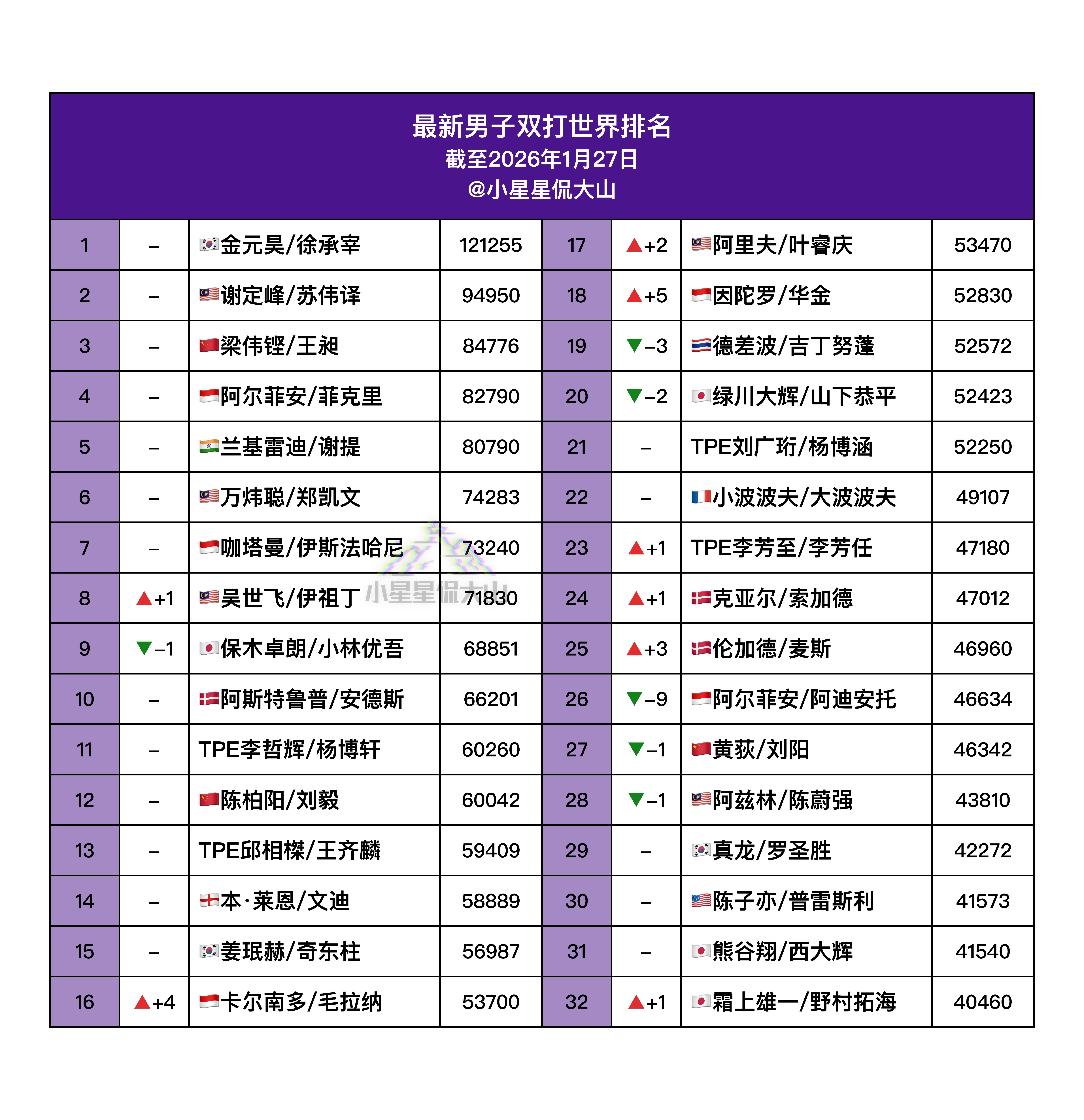 【最新男双世界排名】🇨🇳梁伟铿/王昶 3🏆吴世飞/伊祖丁 9➡️8🇨🇳陈柏阳/刘毅 12🥈因陀罗/华金 23➡️18🇨🇳黄荻/刘阳 26➡️272026年印尼羽毛球大师赛