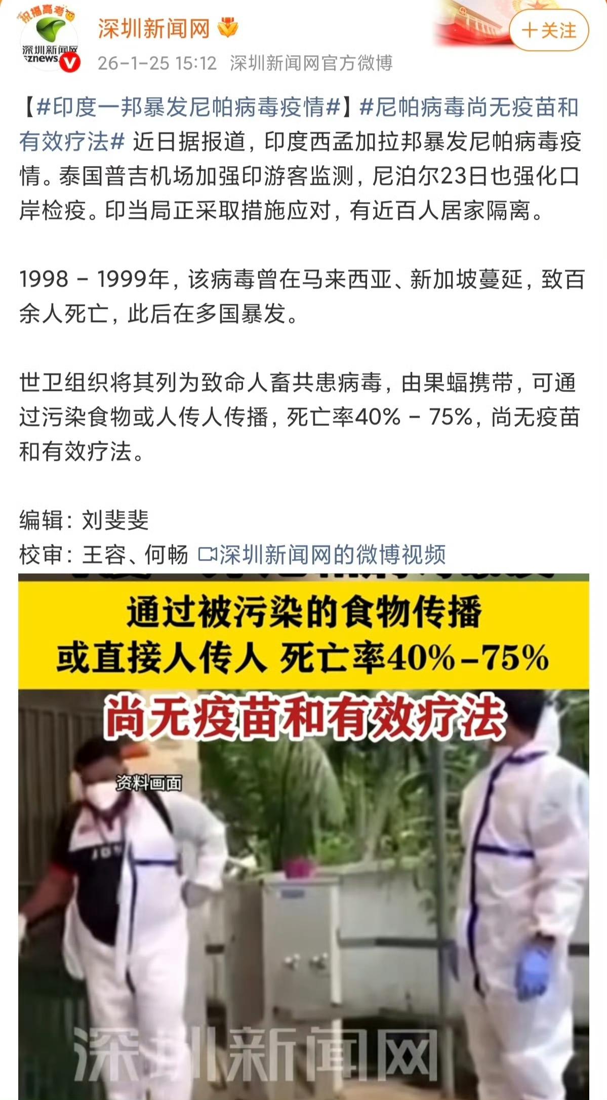 印度西孟加拉邦突发尼帕病毒疫情,已确诊多例且出现人传人,近百人被隔离,多名医护人员感染。该病毒致死率40%-75%,无疫苗和特效药,世卫拉响警报。泰国、尼泊尔等多国紧急升级入境检疫,全球防疫再迎大考。 流行新冠疫情 印度病 印度不明病毒