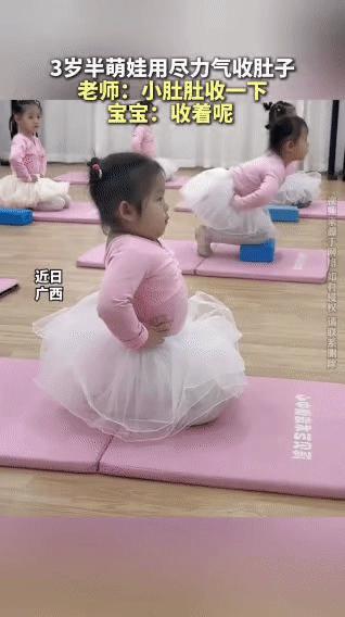 广西的舞蹈课上,3岁半的小萌娃正跟着老师练基本功。老师温柔提醒:“小肚肚收一下哦… 小家伙立刻认真憋气,小手紧紧按住肚子,奶声奶气地回:“收着呢!” 可圆滚滚的小肚子还是倔强地挺着,这可爱的样子把一旁的妈妈逗得笑出了声,萌娃还一脸无辜,仿佛在问:“我收得难道不够标准吗?小女孩舞蹈课 娃学舞蹈 三岁的宝宝跳舞 创意舞蹈基本功