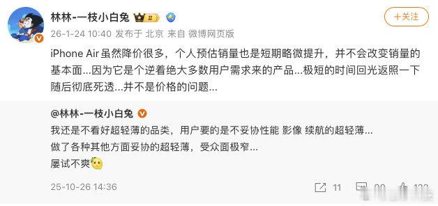 【荣耀林林谈iPhoneAir降价:并不会改变销量基本面】1月24日,荣耀中国区智慧生活业务部部长林林发文谈及iPhone Air降价。他认为,iPhone Air销量会短期略微提升,并不会改变销量基本面,因为它是个逆着绝大多数用户需求来的产品,并不是价格的问题。