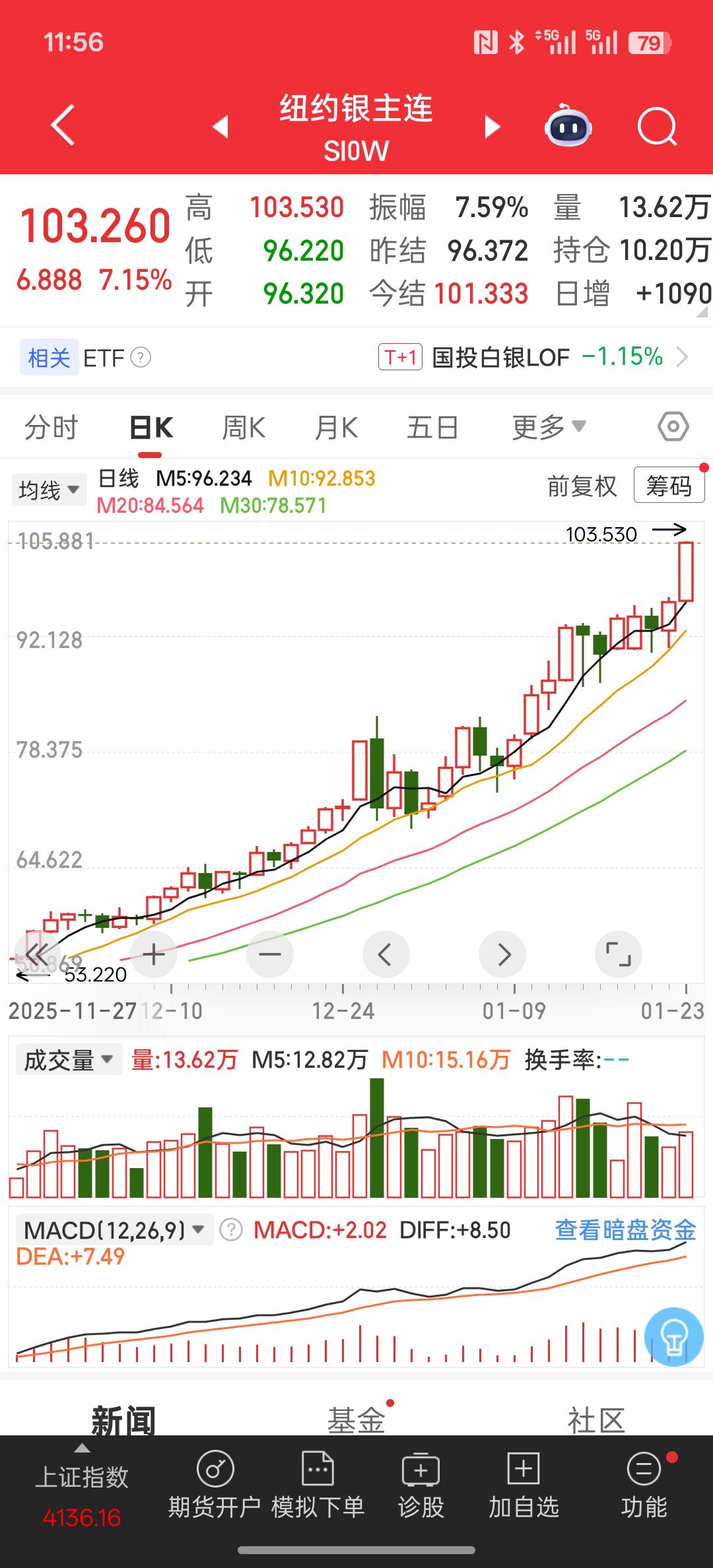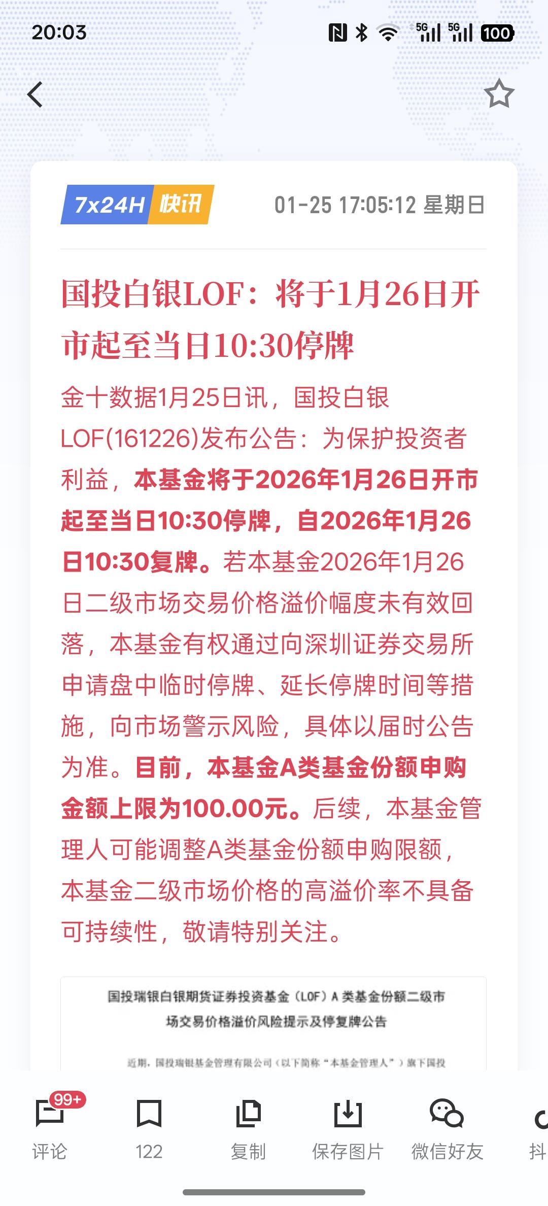 白银本周突破100美元以上!国投白银LOF:将于1月26日开市起至当日10:30停牌!国内继续对国投白银基金进行停牌!而上周就开始停牌!这主要还是防止大规模的资金去追高,黄金涨幅已经达到接近5000美元一盎司!后续还能涨多高?这个是个不确定性!