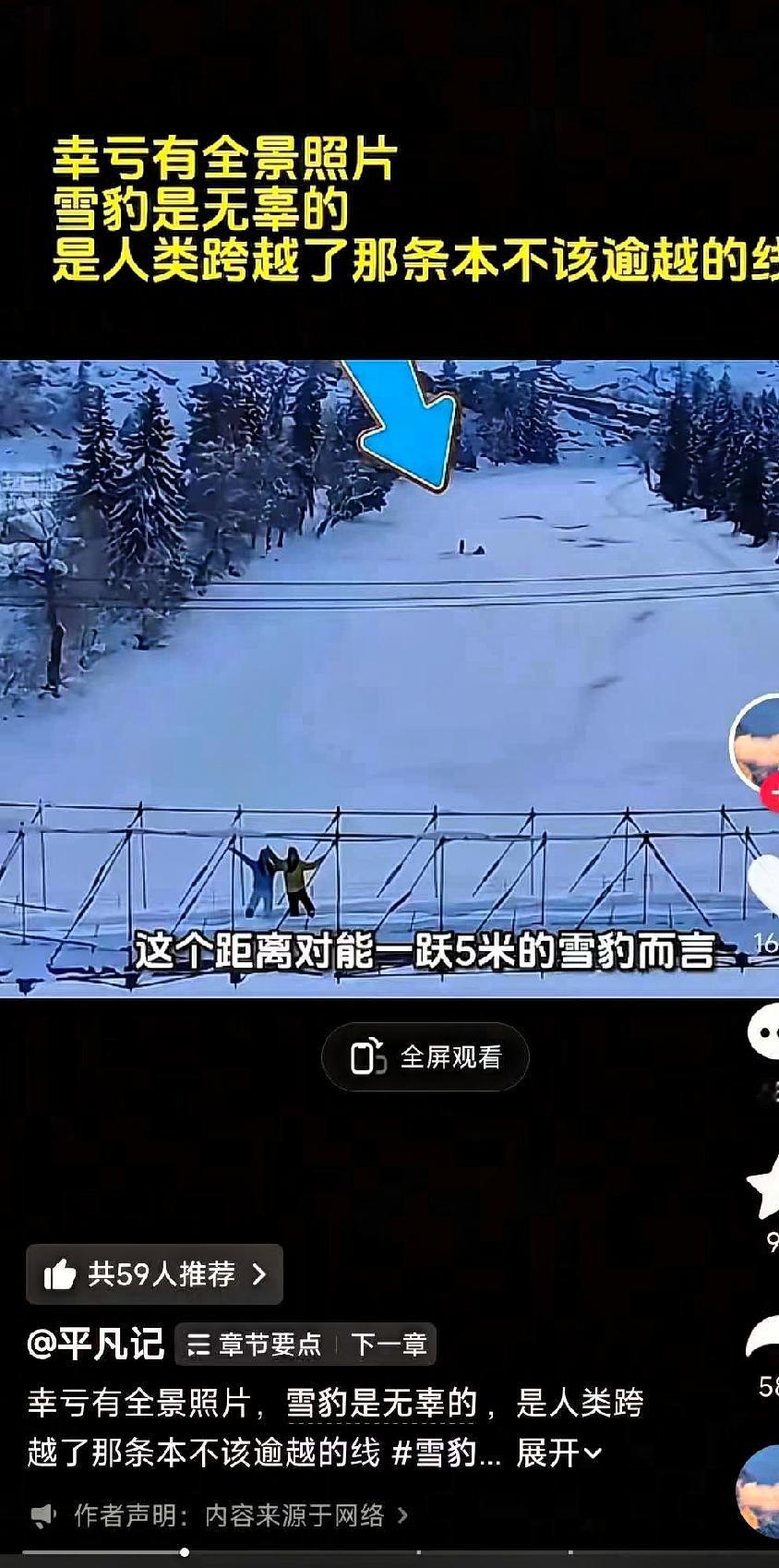雪豹是无辜的,因为有全景照片。该女游客滑完雪回来的路上,全景照片就是最硬的铁证 女游客滑雪返程时撞见禁区里的雪豹,不仅没远远避开,反而翻过围栏凑到5米内拍照,硬生生侵犯了雪豹的领地,这波遭遇反击纯属自找的后果。 谁都知道雪豹天性胆小,它们常年栖息在高海拔雪山,对人类向来避而远之,根本不会主动攻击人。但领地是雪豹赖以生存的空间,是它们觅食、栖息的核心区域,被陌生人突然闯入,还被近距离紧盯拍摄,出于本能的自我保护,它才会做出反击行为,这是再正常不过的反应。 咱在家撸猫撸狗,是因为经过长期驯养,彼此建立了信任关系,可野生雪豹是大自然的野生动物,是需要被尊重和保护的物种,不是供人打卡炫耀的“网红”,更不是能随意靠近的宠物。把对待家养小动物的方式套用到野生动物身上,不仅是对自然常识的无知,更是对生命的不尊重。 敬畏自然从来不是挂在嘴边的空话,而是刻在心里、落实在行动上的准则——不越界、不打扰、不猎奇。遵守景区规定,与野生动物保持安全距离,既是保护它们,也是保护我们自己。别让一时的好奇心,给濒危物种的生存带来不必要的舆论争议,更别让一次违规的行为,给自己带来无法挽回的伤害。