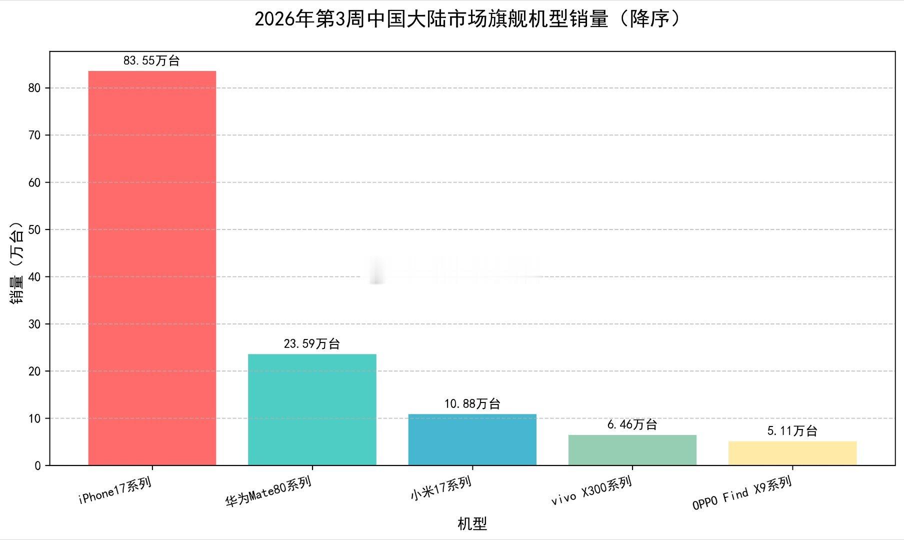 2026年第3周中国大陆市场旗舰机型销量情况iPhone17系列:83.55万台华为Mate80系列:23.59万台OPPO Find X9系列:5.11万台vivo X300系列:6.46万台小米17系列:10.88万台(数据来源:RD观测)