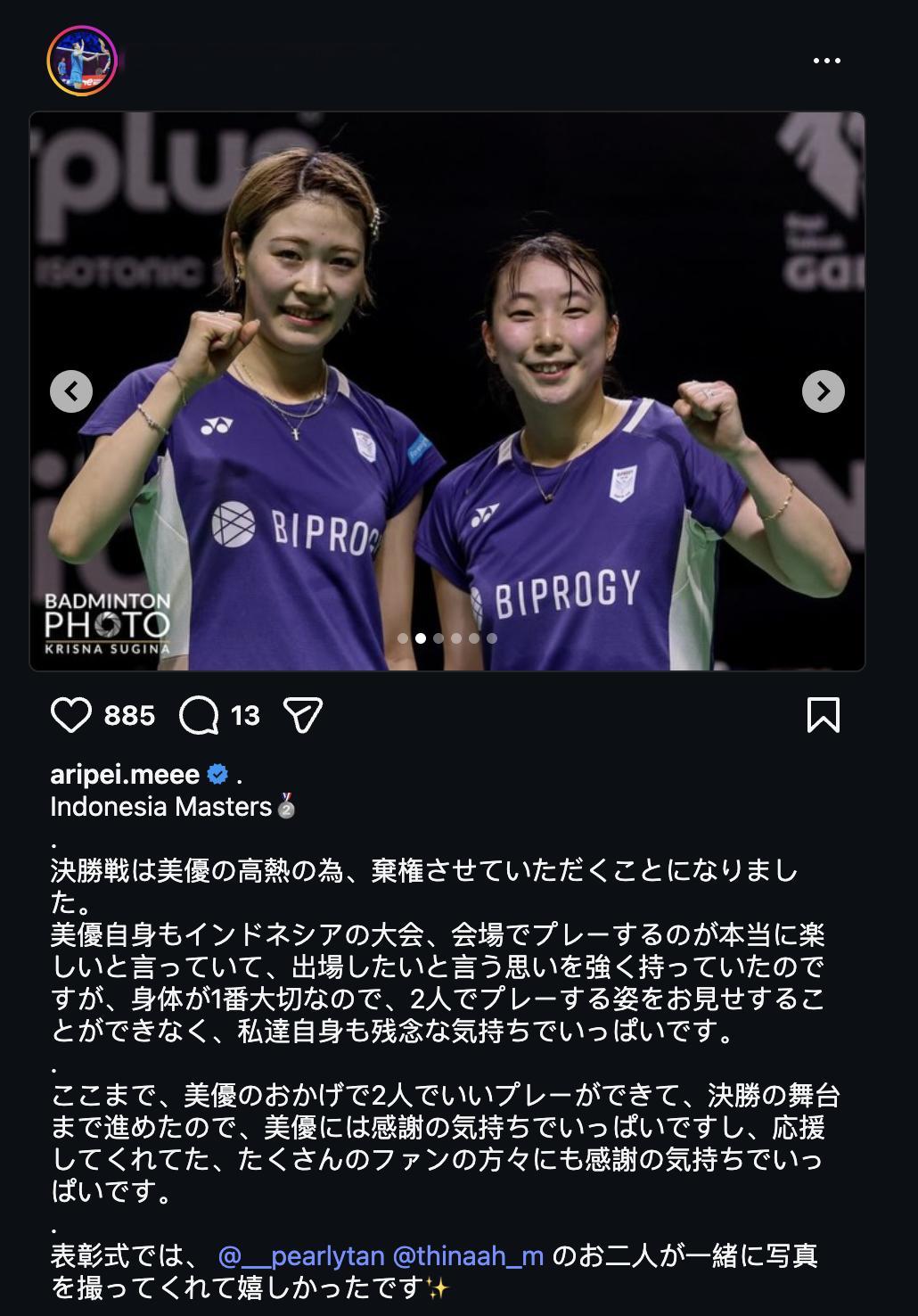 五十岚有纱发文解释退赛原因:由于美优突发高烧,我们不得不遗憾地退出决赛。美优本人一直说在印尼的比赛和场馆里打球非常开心,她自己也抱有极其强烈的参赛愿望。但身体才是最重要的,很遗憾无法向大家展示我们并肩作战的身影,我们内心也感到万分遗憾。能够走到今天,全靠美优的努力,让我们两人打出了精彩的配合并一路晋级决赛。因此,我对美优充满了感激之情。同时,也要对一直支持我们的广大粉丝们致以最诚挚的谢意 2026年印尼羽毛球大师赛