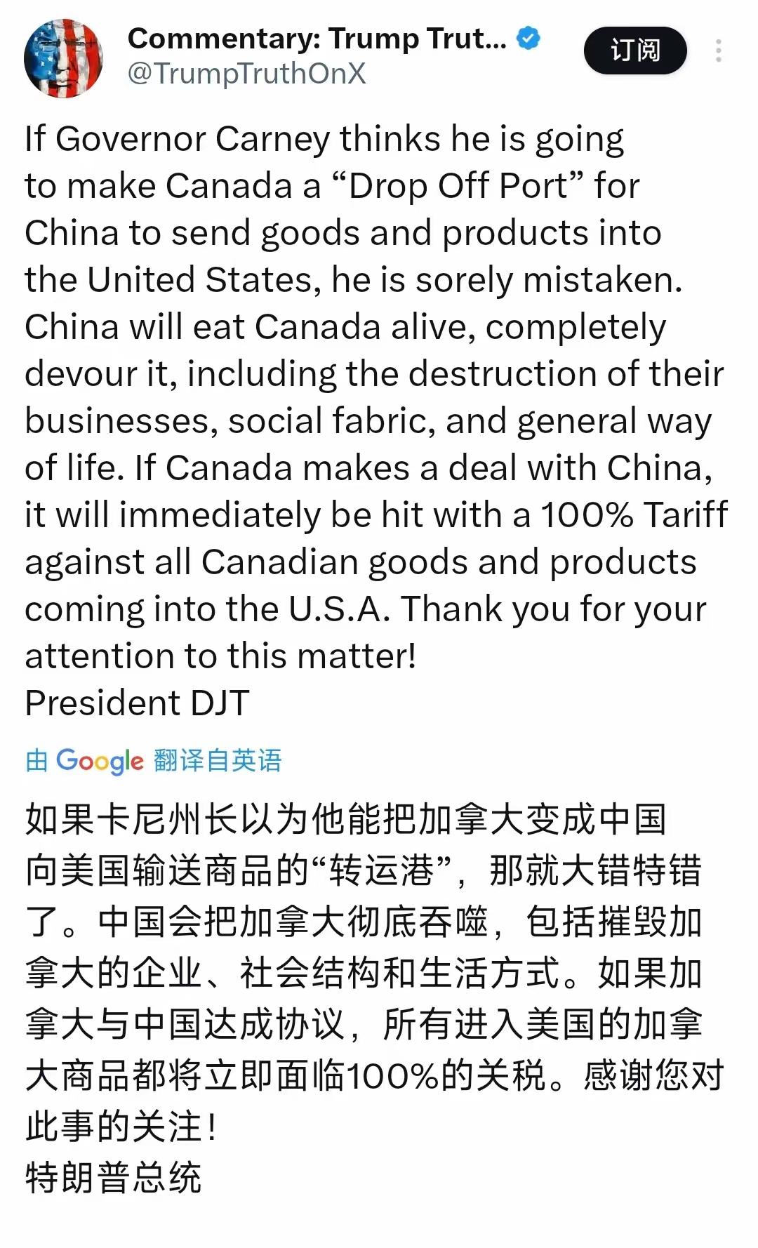 特朗普威胁加拿大:若与中国达成贸易协议就征100%关税!特朗普原本就是威胁加拿大!这美国才是最想吞并加拿大的国家!因为美国对加拿大发出了之前的威胁!加拿大经贸出口方面依赖美国的市场高达70%!很多时候都是用美元结算! 那加拿大与中国的合作,反而是在为加拿大留了条后路!也是为加拿大加了一档强有力的经济发展的保险!别看这2000亿的货币互换贸易协定,其实就是在帮助加拿大金融系统未来在贸易方面的稳定!如果再用美元霸权收割其他国家!那这2000亿的货币互换,就是加拿大最有力的保障!