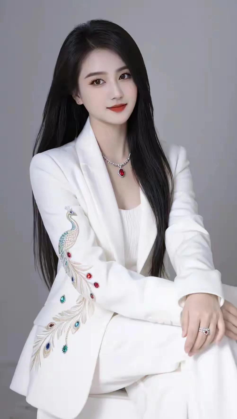 优雅白西装,精致羽毛刺绣,红宝石项链,气质满分!