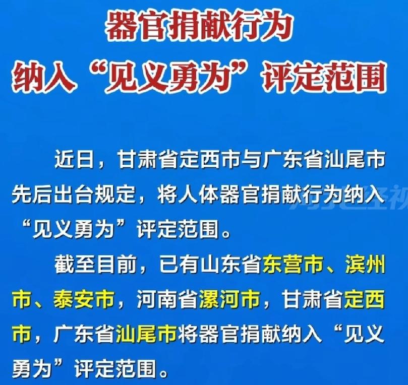器官捐献认定为见义勇为,这个政策好!拿自己的命换别人的命得以重生,这种最高的无私奉献,比日常落水救人、火灾救人更伟大,这无疑是最高的见义勇为!器官捐献需要极高的认知、极高的勇气,以前没有认定这个荣誉,现在终于补上了,这是对献出器官做出牺牲者一种荣誉认可,也是对家人的一种感谢!向每一名器官捐献者致敬!
