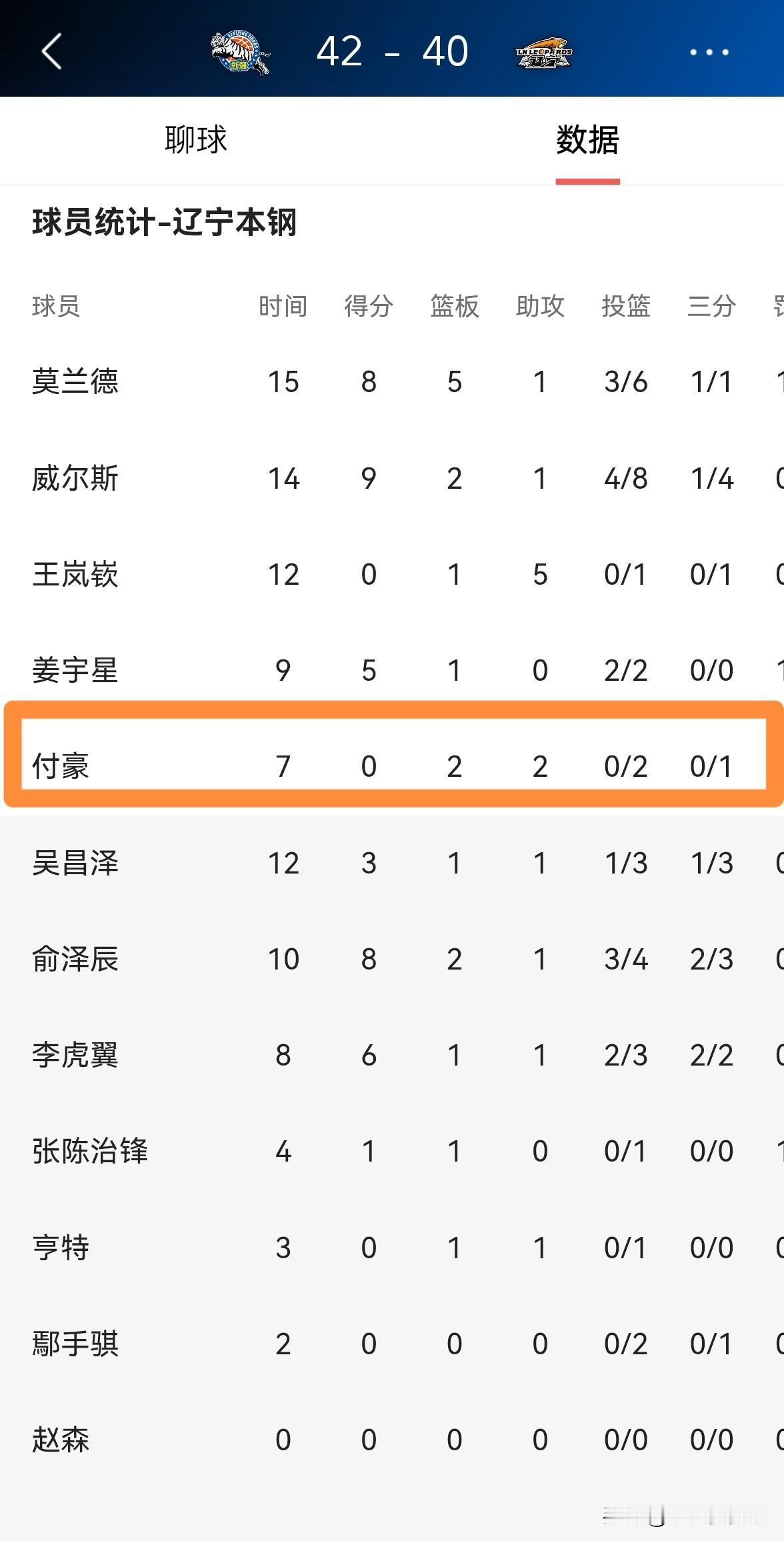 辽宁本钢大将付豪真是出工不出力!在今天辽宁本钢客场挑战新疆伊犁特的比赛中,目前双方半场战罢,辽宁本钢以40:42落后于对手。在前两节比赛中,付豪首发出战7分钟,投篮2中0怒砍0分,他的场上正负值为-9。 毫不客气的说,在上半场比赛中,付豪纯粹是出工不出力,他在攻防两端都没有为球队提供应有的帮助。