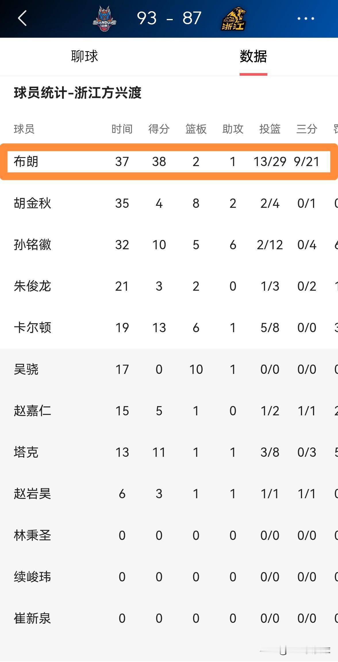 浙江方兴渡外援布朗真是神鬼难测!虽然今天浙江方兴渡在客场以87:93惜败于山东高速,但是布朗在下半场比赛中如有神助爆砍35分,险些带领球队实现惊天逆转。 全场比赛下来,布朗首发出战37分钟,投篮29中13,其中三分球21中9、罚球4中3爆砍38分。 最让人感到不可思议的是,布朗在上半场比赛中仅仅得到3分,但是他在下半场比赛中忽然状态火爆狂轰35分,这神鬼难测的表现真是让人受不了。