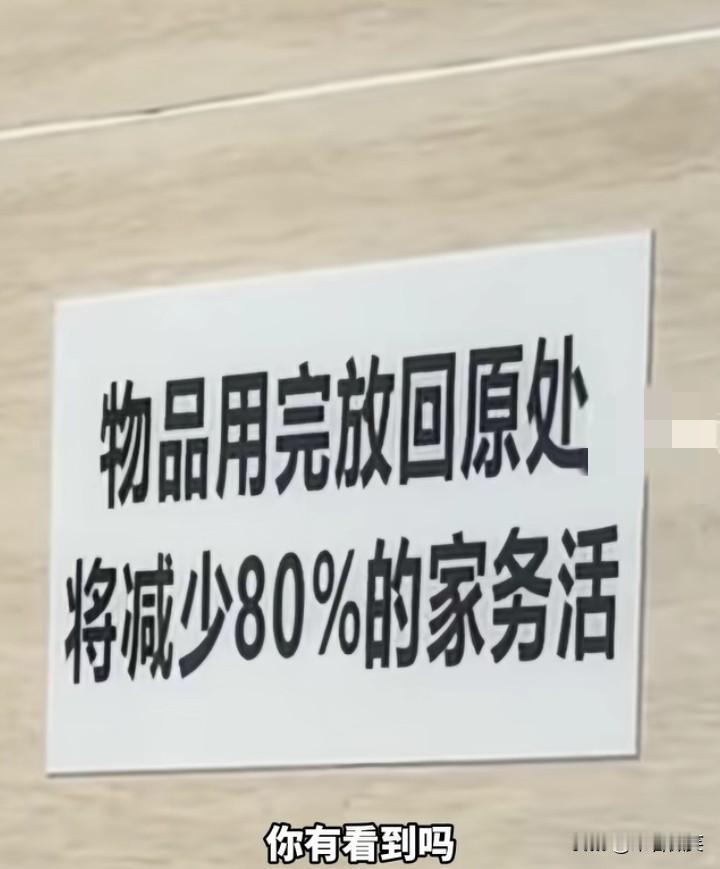 非得活得这么累吗?妻子为了提醒丈夫改掉乱放东西的生活习惯,花了20块钱做了一个标语:物品用完放回原处,将减少80%的家务活。 也就是说,用过的毛巾要挂回原处,鞋子要放回鞋架或鞋柜里,妻子的意思就是说,家里面要保持干净、整洁、卫生。 我不知道别人怎么样,但我作为一个男生,我是真做不到!觉得这样活着好累! 鞋子脱了就直接放门口了,扫完地扫把随手就放在角落了,毛巾擦完就胡乱搭在架子上了。 也许我们这样的人有点邋遢吧!但我觉得在外面装孙子装了一天,回到家还不能随性一点,这样活得不累吗?