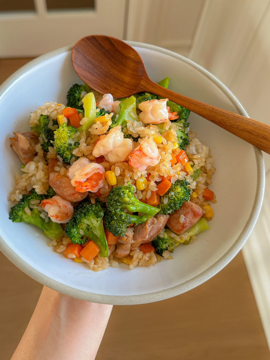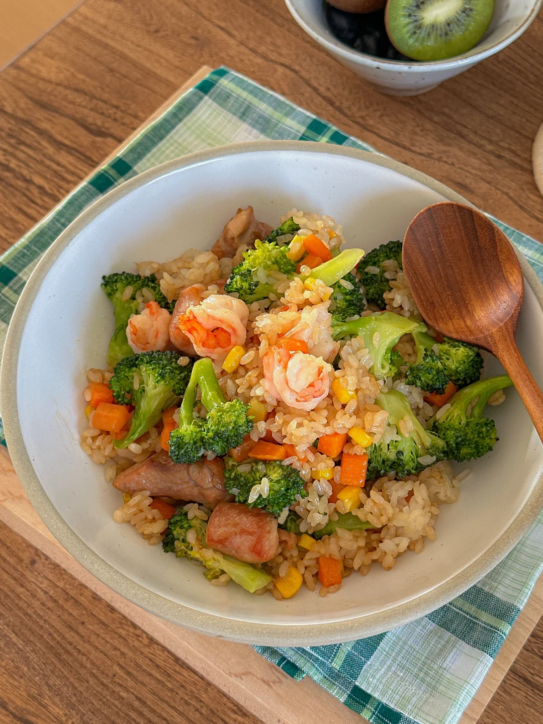 为自己炒一碗西兰花虾仁鸡腿肉饭🥦🍤