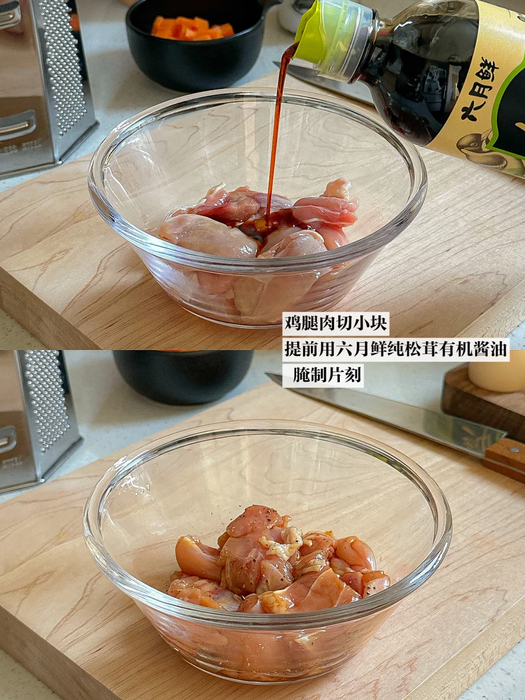 鸡腿肉先用六月鲜纯松茸有机酱油简单腌制,这款酱油选用来自西藏3500米高原的有机松茸,和生长在休耕三年黑土地上的有机大豆和小麦 ,历经时间沉淀酿造而成的高品质精华~而且拥有中欧有机双认证,美味又安心!