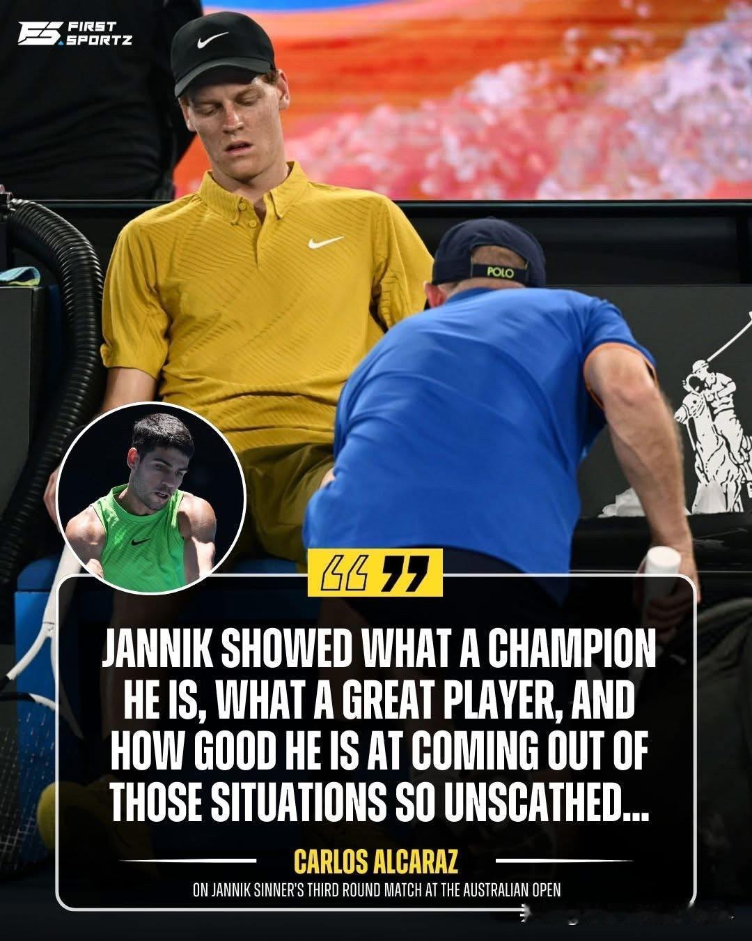 卡洛斯·阿尔卡拉斯就老对手扬尼克·辛纳在澳网第三轮比赛中顶着高温和抽筋的困扰艰难取胜一事发表了看法。 世界排名第一的阿尔卡拉斯说:“扬尼克展现了他冠军的风范,他是一位伟大的球员,而且他总能毫发无损地从困境中脱身。” 卫冕冠军辛纳在第三轮面对斯皮齐里因抽筋陷入了巨大的困境,但幸运的是,阳光救了他。 由于高温防控措施,比赛被迫中止,这或许直接挽救他的澳网之旅。 但阿尔卡拉斯的情商还是很高,直接跳过了高温防控一事,赞扬了辛纳是一位能够从逆境逃脱的伟大冠军,实在给足了面子!