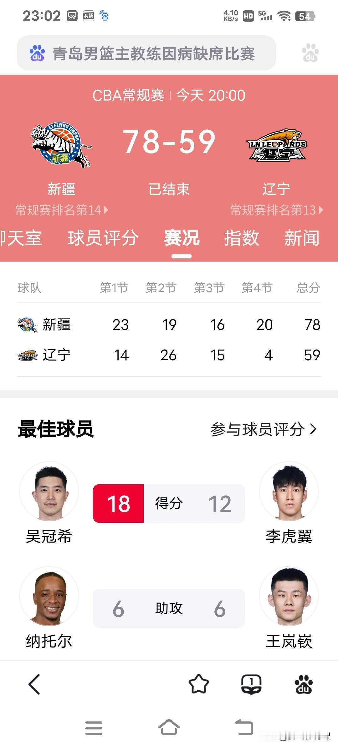 单节仅4分,全场比赛仅得到59分。 你很难相信这是连续5个赛季打进总决赛荣获三连冠的辽宁队打出来的比赛,这不是热身赛,这是常规赛的正式比赛,第四节全队仅得到4分,不得不怀疑球员在场上的态度有问题,主教练杨鸣需要重审球队的方向,以这样的输球方式恐怕令几千万的辽宁球迷心寒而退缩,既然看不到冲击季后赛的希望,还不如尽早决定培养年轻球员为主,避免支持球队的球迷再次流失。 辽宁客场59:78惨败新疆遭到本赛季的第二次四连败!