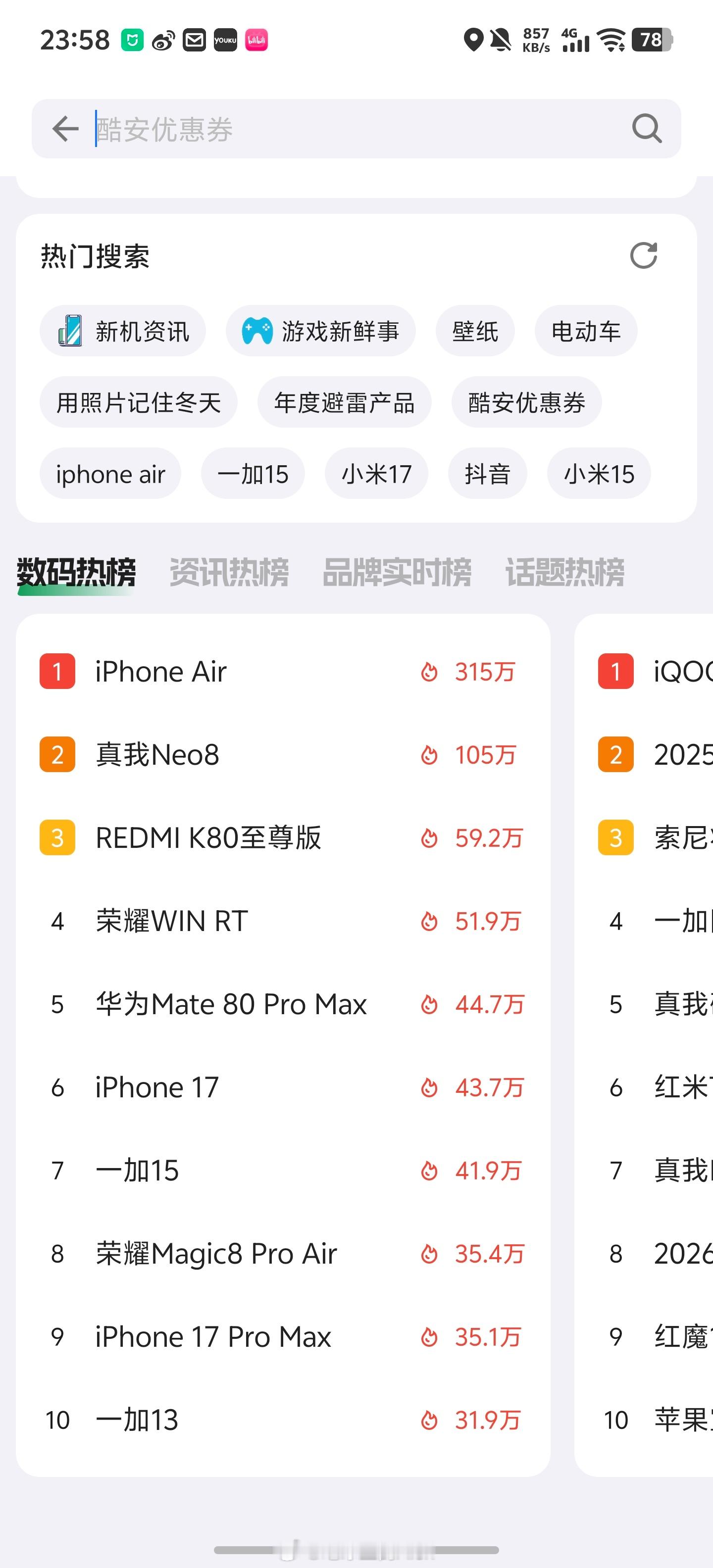 iPhone Air在酷安的热度已经315万了有史以来的最强热度