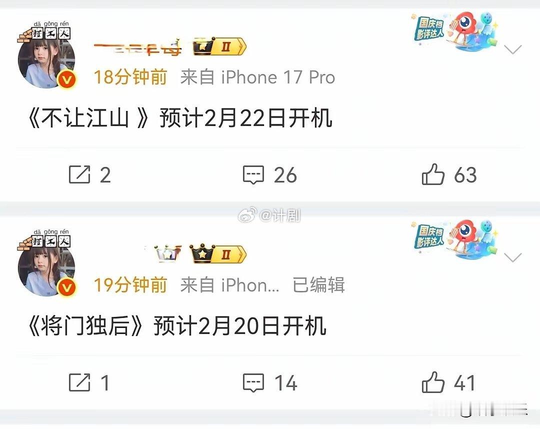 两部大剧都要开机了!杨洋的《不让江山》2月20日开机,女主确认周洁琼。王鹤棣和孟子义的《将门毒后》2月22日开机,前两天还有网友爆料王鹤棣不演《将门毒后》了,今天就有瓜主爆了开机时间。感觉《不让江山》开机时间应该大差不差,主演阵容也基本确定,一切都在有序的推进中。《将门毒后》可就不一定了,从选角开始这部剧就风波不断,一会说孟子义退出,一会说王鹤棣意向约到期的,没个准确的消息。