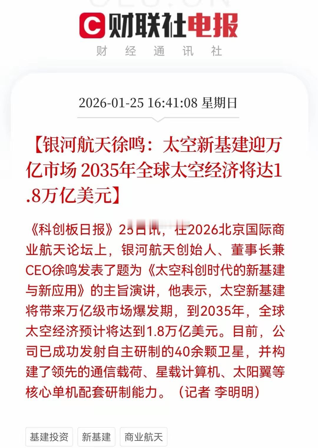 商业航天再发重磅消息,这次是1.8万亿美金,下周板块能否继续大爆发呢?银河航天徐鸣表示,太空新基建将带来万亿级市场爆发期,到2035年,全球太空经济预计将达到1.8万亿美元。真的是太牛了,商业航天中美是遥遥领先的,去除美国部分,我们占比大概率也不低吧。太空新基建太多了,除了上周的太空+光伏,周末发酵的是太空+AI,这个想象空间足够大了。但是周末题材的监管又来了,锋龙股份、嘉美包装:股票将于1月26日起停牌核查。商业航天龙头股,中国卫星和航天电子都发出风险提示。下周板块行情真的是“哑谜”了,谁都说不清会怎样走吧,这次就看“信仰”了。特别是商业航天板块上周最后两天暴涨超6%,短线抄底资金是赚的盆满钵满的,这个还是要谨慎。