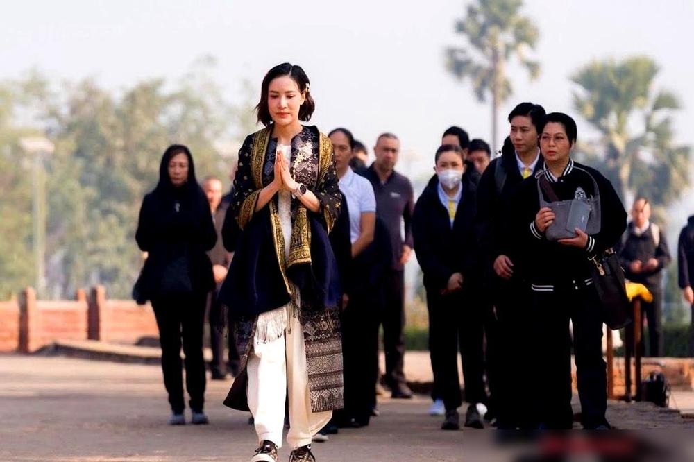 泰王这出“回家的诱惑”真是百看不厌,消失许久的诗妮娜竟然在印度河边来了个华丽返场。 谁能想到41岁的生日大礼不是珠宝,而是顶着皇室名义去佛祖悟道的地方“远程出差”。这哪是去祈福求平安,这分明是隔空给曼谷那帮人上眼药:本宫虽然不在宫里,但圣宠的快递可从没断过。 那身米色刺绣上衣配棉麻裤子,看着挺素净,可脚底下那双扎眼的Dior老花鞋直接暴露了野心。别被这副清修的模样给骗了,能在佛祖跟前代表国王执行公务,这身份的含金量比任何头衔都硬。 这地方选得也挺有深意,当年佛祖在那儿受了供养才悟道,她跑这儿露脸,潜台词全是“姐要涅槃重生了”。 泰国王室这出宫斗戏演到现在,只能说明一个真理:只要泰王那颗心还没定性,所谓的“废妃”就只是换个地方休个带薪年假。