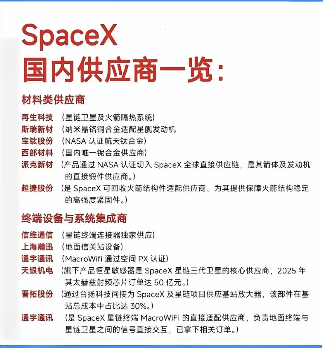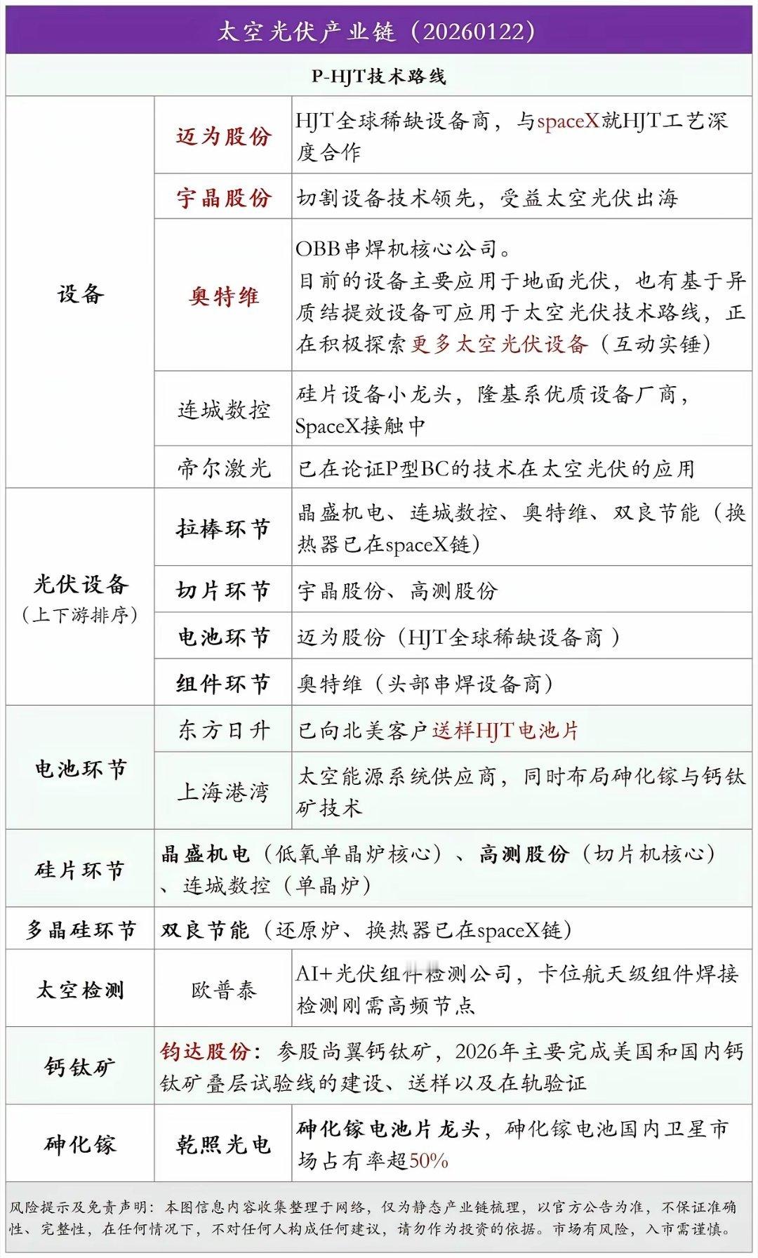 商业航天时代,卫星规模化组网与星载设备功能升级,正从数量与质量双维度推动太空光伏需求增长。在技术迭代与产业趋势的双重加持下,太空光伏的长期发展空间已清晰显现,有望成为光伏产业新的增长蓝海。相关标的:潜力链:迈为股份、宇晶股份、信维通信、蓝思科技、奥特维、连城数控、双良节能等。火箭:航天动力、飞沃科技、西部材料、航天机电、超捷股份、斯瑞新材、广联航空等。卫星:中国卫星、明阳智能、上海瀚讯、臻镭科技、航天宏图、中科星图、海格通信、烽火通信、中国卫通、高华科技、陕西华达、航天电器、电科数字、佳缘科技、盟升电子、震有科技、通宇通讯等。太空算力:顺灏股份、普天科技等。3D打印:华曙高科、银邦股份、铂力特等。财经观察官股市微博股票a股