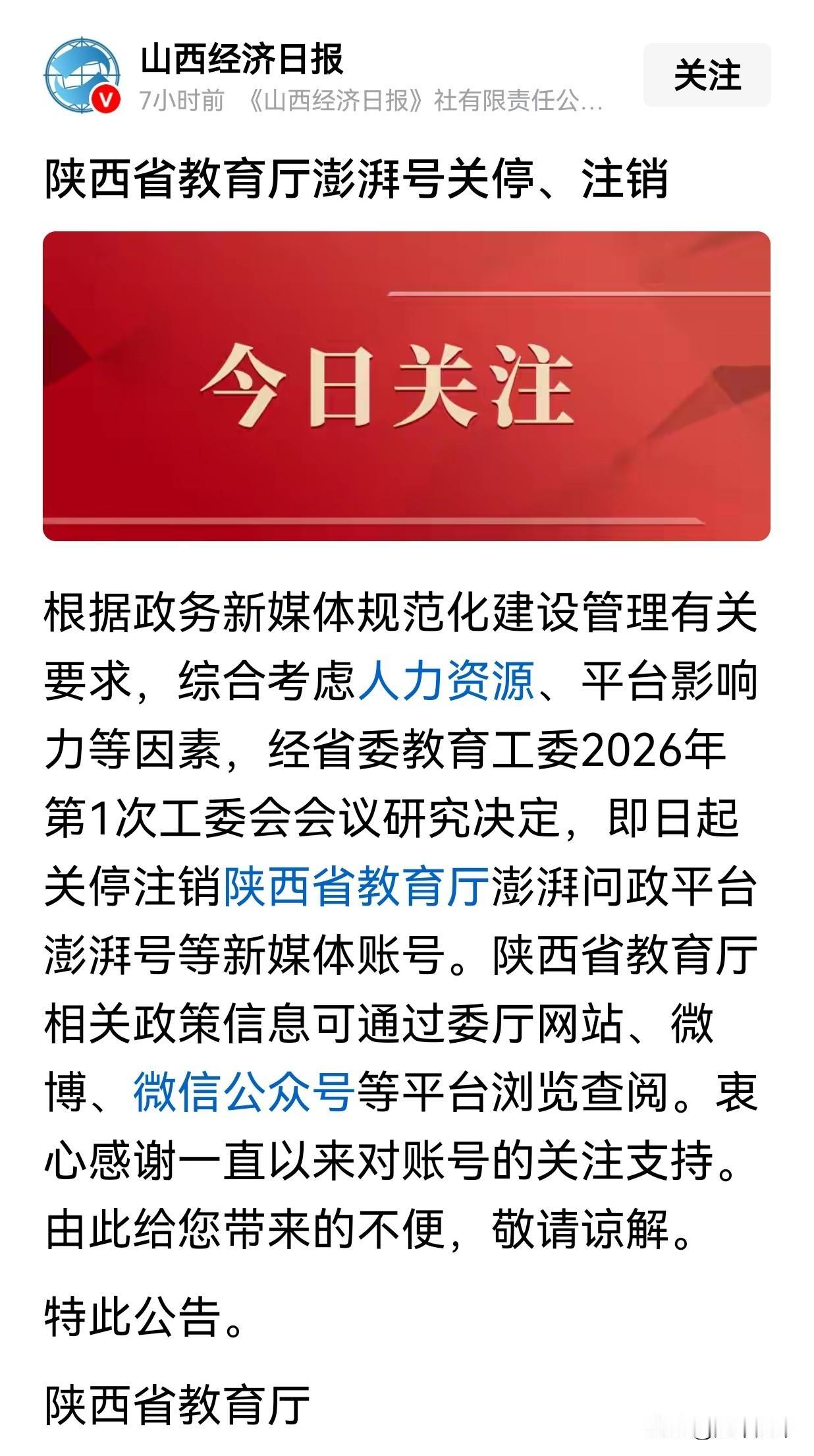这是为何?陕西省教育厅澎湃号关停注销。 澎湃号是上海报业集团旗下的新闻媒体平台,属于互联网新闻资讯类媒体。它的主要内容定位是时政与思想,提供新闻资讯服务。它并非单一账号,而是一个开放的内容聚合与发布平台,支持政务机构(政务号)媒体(媒体号)和个人创作者(湃客号)入驻发布内容。 而此次陕西省教育厅的澎湃问政平台账号(澎湃号)自26年1月23日起关停注销。是由陕西省委教育工委在26年第1次工委会会议审议通过,属于主动关停行为。 关停主要基于两方面因素。为落实政务新媒体规范化建设管理要求,精简平台数量,提升管理效率。综合考虑人力资源配置和平台实际影响力,避免重复运营。 公告明确提示,后续陕西省教育厅的政策信息,保留微博、微信公众号等平台。此次关停可视为进一步集中资源的举措。此次关停反映了政务新媒体从“多平台覆盖”向“精准化、高效化运营”的转型趋势。