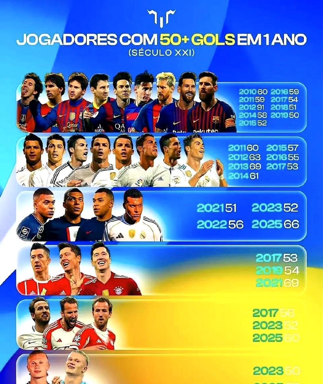 91球,一年踢进别人三年量,梅西这数字像外星丢下来的,后面谁追都是喘着粗气。 C罗69球看着差22粒,放别人身上已是极限,他却当日常打卡。 莱万同年也刷到69球,可惜掌声被梅罗抢光,实力到位,流量欠费。 现在轮到小年轻:姆巴佩66球最抢眼,凯恩60球终于把英格兰队长标签换成“炮王”,哈兰德57球还在发育。 数据热闹,但91球那道线仍旧挂天上,抬头能看见,踮脚够不着。 年年喊“新王登基”,年底一看,还是老头子画的起跑线。