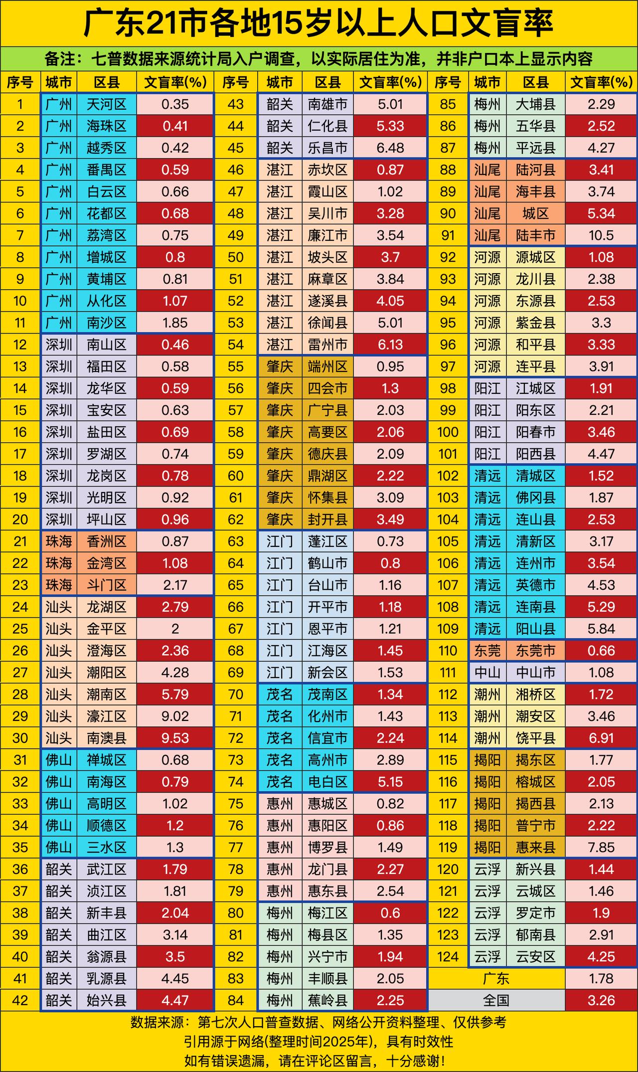 广州作为一线城市,天河区那文盲率才0.35%,就跟拔尖的好学生似的,一路领跑。可再瞧瞧有些地方,差距就有点大了。这就好比班级里,有的同学次次考高分,有的同学却在及格线边缘疯狂试探,真是一方水土养一方人,教育水平在这数据里体现得明明白白。 再瞅瞅深圳,好家伙,大部分区县的文盲率都不算高,妥妥的学霸阵营。南山、福田这些地方,经济发达,教育资源丰富,家长们也都重视孩子的学习,这文盲率低那是理所当然。不过呢,深圳也有相对弱点的区域,但整体表现还是相当亮眼的,就像班里的尖子生群体,偶尔有一门成绩没那么突出,但不影响整体的优秀。 接着看看其他城市,那差异就更明显了。潮州的湘桥区、汕头的一些区县,文盲率相对较高。这就像是班级里的后进生,需要加把劲儿了。教育资源不均衡、经济发展水平的差异,或许都是导致这些问题的原因。咱也不能光看数据就批评,得想想办法怎么去帮助他们提高,毕竟大家好才是真的好嘛。 最后,从全国平均水平来看,广东有些地方高于平均,有些低于平均。这说明广东在教育发展上还有很长的路要走。咱不能光跟自己比,还得跟全国比。希望各地能重视起来,多投入些教育资源,让每一个孩子都能接受良好的教育,把广东的这片“成绩单”变得越来越好看,别让那些高文盲率的区域拖了后腿哟!