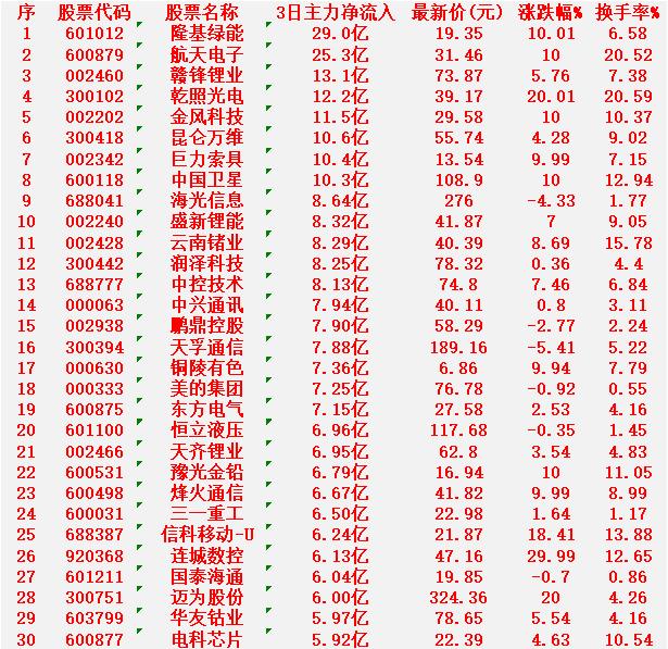 1月26日,前3天主力大幅买入的30名单! 隆基绿能:净流入 29.0亿元,涨幅 +10.01%(涨停),换手率 6.58% 航天电子:净流入 25.3亿元,涨幅 +10.00%(涨停),换手率 20.52% 赣锋锂业:净流入 13.1亿元,涨幅 +5.76%,换手率 7.38% 乾照光电:净流入 12.2亿元,涨幅 +20.01%(创业板/科创板涨停),换手率 20.59% 金风科技:净流入 11.5亿元,涨幅 +10.00%(涨停),换手率 10.37% 昆仑万维:净流入 10.6亿元,涨幅 +4.28%,换手率 9.02% 巨力索具:净流入 10.4亿元,涨幅 +9.99%(涨停),换手率 7.15% 中国卫星:净流入 10.3亿元,涨幅 +10.00%(涨停),换手率 12.94% 海光信息:净流入 8.64亿元,跌幅 -4.33%,换手率 1.77% 盛新锂能:净流入 8.32亿元,涨幅 +7.00%,换手率 9.05%