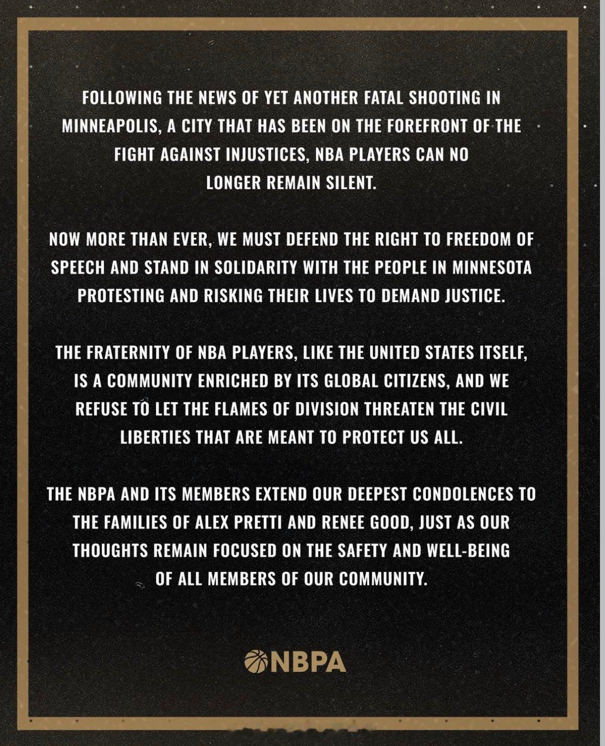 NBA球员工会就明尼苏达州发生的事件发表了声明。