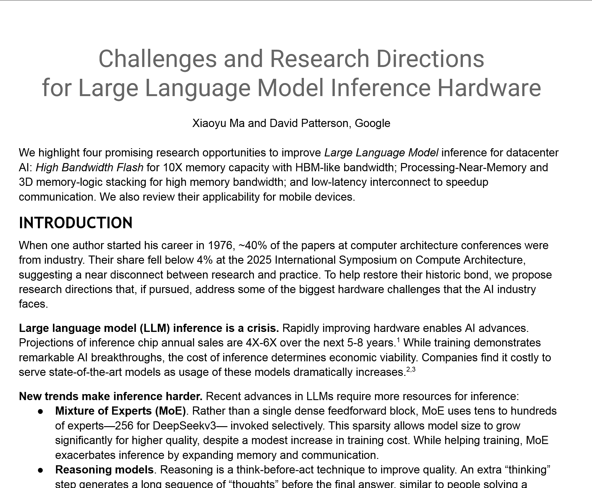 DeepMind的Xiaoyu Ma, David Patterson发了篇论文介绍大语言模型推理硬件的挑战与研究方向。《Challenges and Research Directions for Large Language Model Inference Hardware》arxiv.org/abs/2601.05047在大模型推理里,尤其是逐 token 生成的阶段,性能和成本越来越不是由算力决定,而是由把大量参数与中间状态在合适时间送到计算单元所需的内存容量、内存带宽和互连时延决定;因此单纯堆更多计算单元或更大算力并不能线性改善吞吐/时延,反而会把系统推向更昂贵、更耗能、网络更复杂的形态。文章据此建议把硬件与系统研发重心转向四类更匹配推理负载的方向:1. 用更高密度、更低成本的本地存储承载权重(如高带宽闪存)以减少跨节点搬运;2. 把部分计算更靠近内存以降低数据移动能耗并简化分片(PNM/近存计算);3. 通过 3D 堆叠把逻辑与内存接口做得更宽更短以提升带宽/瓦并降低数据传输能耗;4. 把互连设计从“追求总带宽”转为“降低小消息通信的端到端时延”,因为推理的尾延迟常常由多芯片协同中的通信延迟主导。HOW I AI