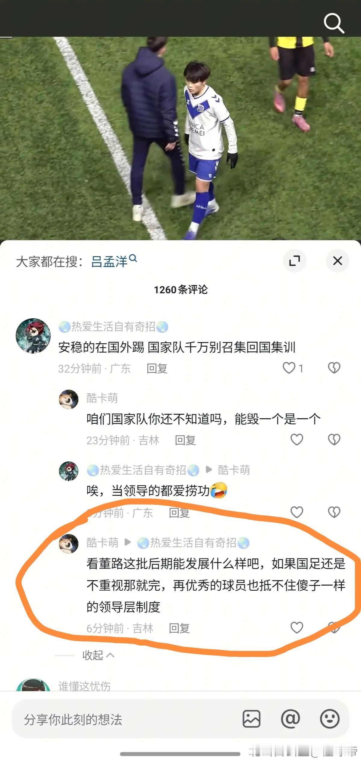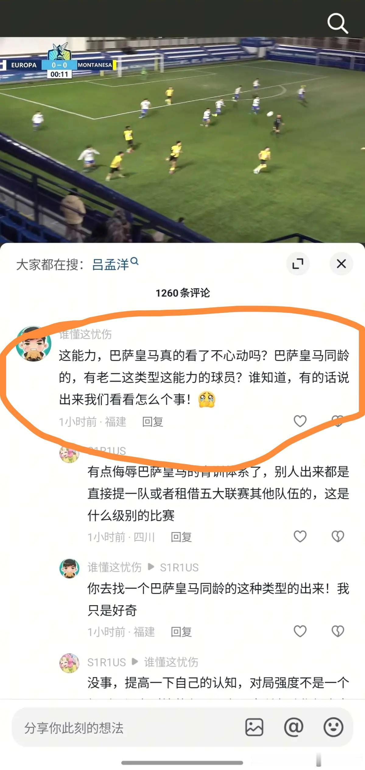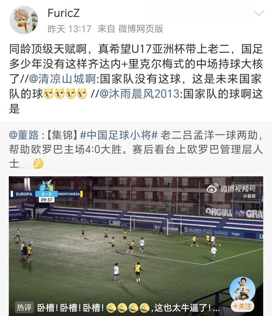 吕孟洋一球二助攻登上热搜! 广大球迷认为:已经远超同龄时期的蒿俊闵,是达到齐达内+里克尔梅式的中场大核,这就是未来巴萨主力的水平!大家可以看看,群众的眼睛是雪亮的,看看下边大家的评论。 现在在这样的表现,中国U17接下来会不会让吕孟洋入选,明年吕孟洋能不能继续留在西班牙。或者说直接被五大联赛抢人签约,即使没有参赛证,也可以先被皇马巴萨签约,然后外租。 毕竟大家也表示,这是中国足坛近二十年难得一见的足球天才!