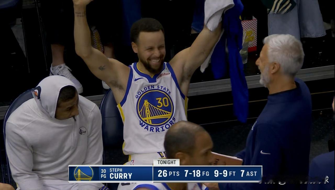 勇士老将库里真是开心的不得了!在今天勇士客场挑战森林狼的比赛中,当时比赛进行到了第四节,勇士领先森林狼超过20分,基本上胜局已定了,这个时候转播镜头给到了勇士的替补席,只见37岁的库里呲着牙咧着嘴笑得特别开心,整个人看起来兴奋极了,从库里的面部表情来看,他对球队的表现是相当的满意。