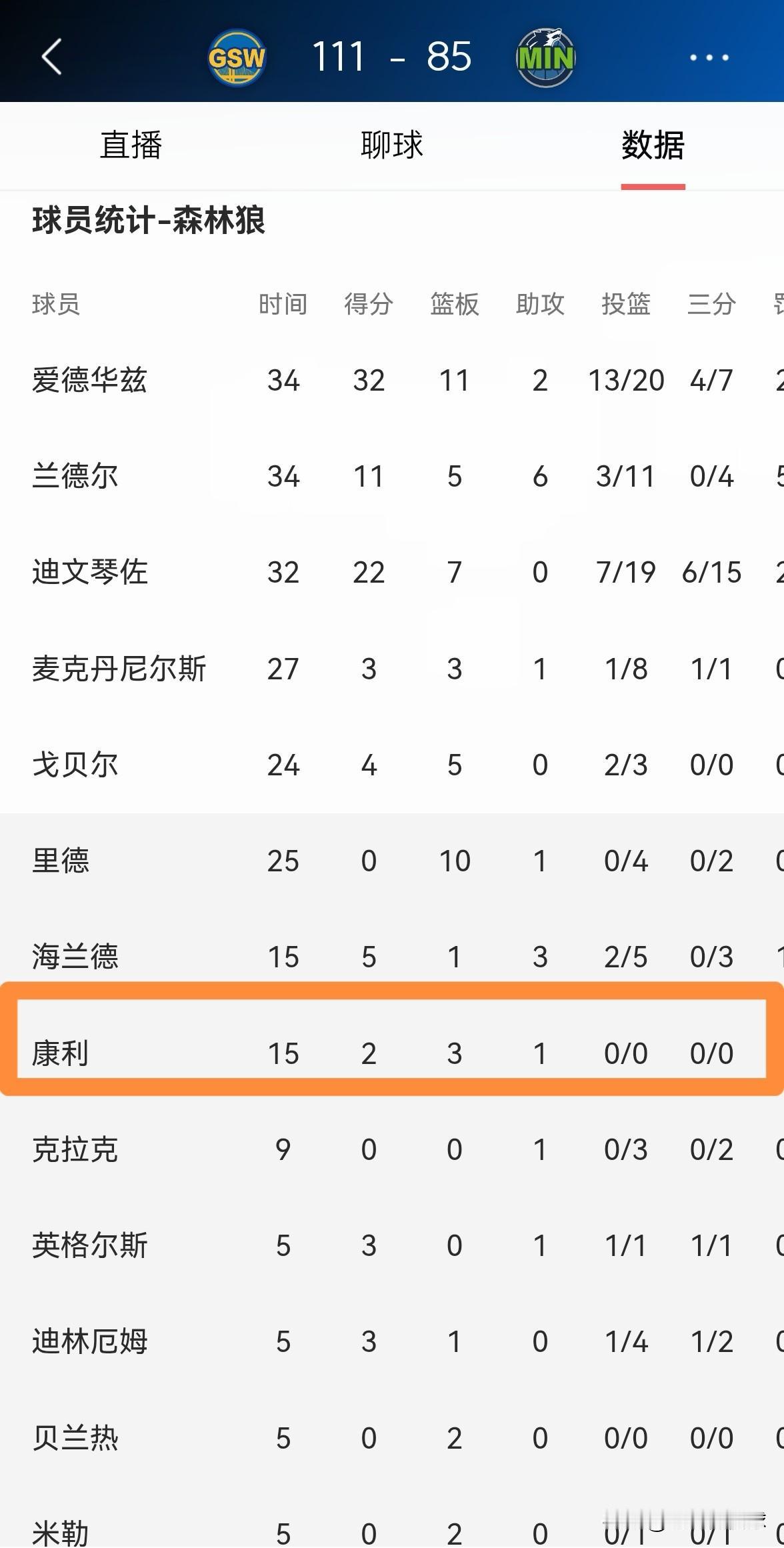 我强烈建议森林狼立刻裁掉老将康利,康利真是毫无用处!在今天森林狼客场以85:111惨败于勇士的比赛中,康利在攻防两端的表现都非常糟糕。 全场比赛下来,康利替补出战15分钟,没有出手仅仅依靠罚球得到2分,他的场上正负值为-14。 毫不客气的说,如今的康利在场上不仅投不进球,而且防不住人,只要康利上场,森林狼必然输分,他完全成为了球队的负担,试问像这样的球员,森林狼留之何用?