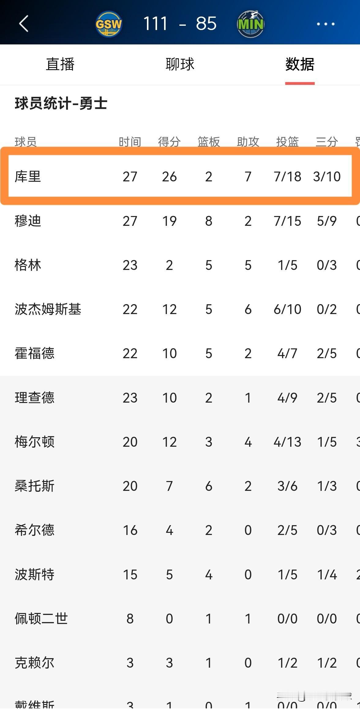 我必须要怒赞勇士巨星库里的防守!在今天勇士客场以111:85大胜森林狼的比赛中,尽管库里的进攻效率一般,但是他在防守端贡献了4次抢断,展现出了超强的防守积极性。 全场比赛下来,库里首发出战27分钟,投篮18中7,其中三分球10中3、罚球9中9得到26分2篮板7助攻,还有全队并列最多的4次抢断,他的场上正负值为+16。