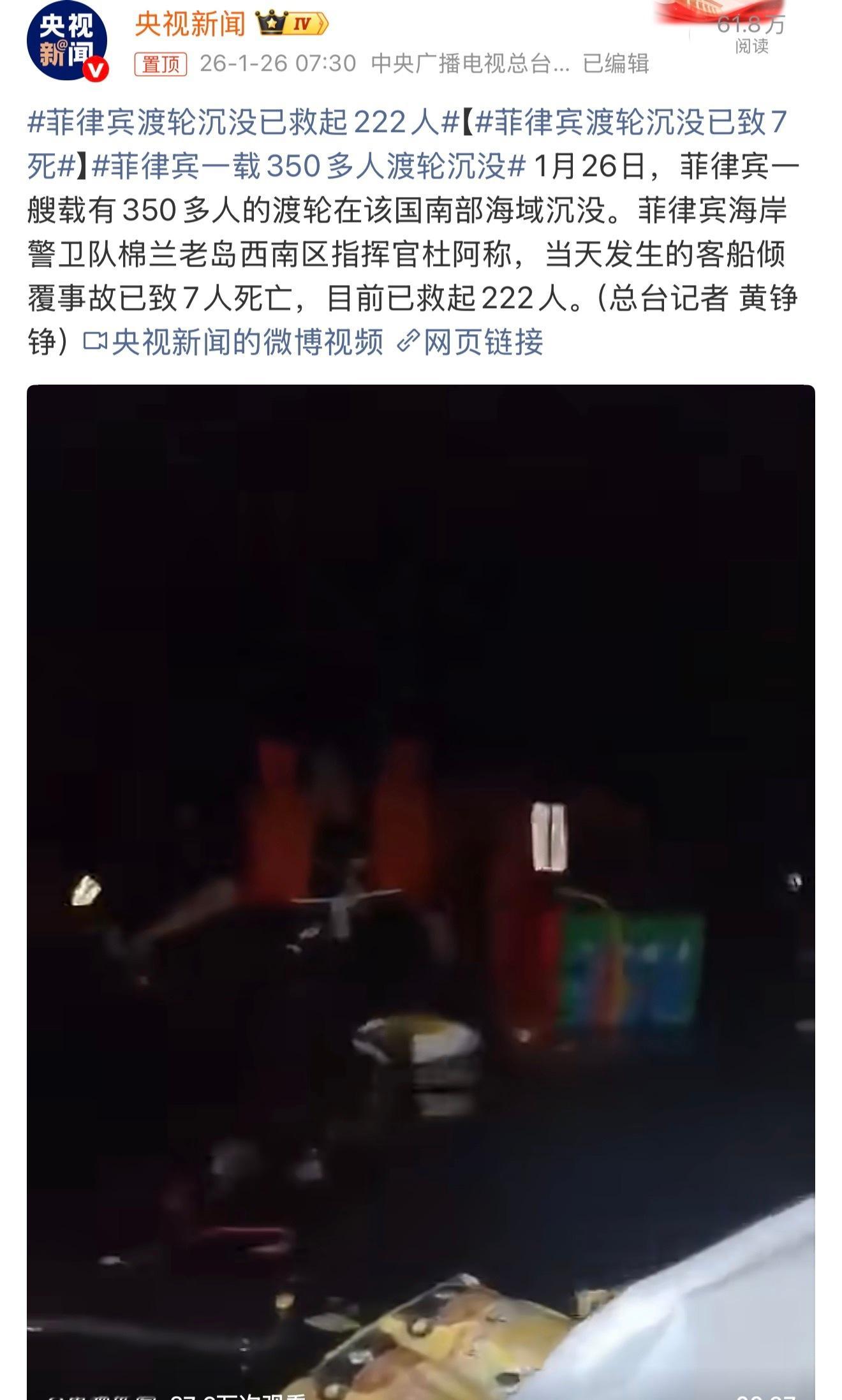 菲律宾一载350多人渡轮沉没三百多个人的渡轮说沉就沉,已经有遇难者,深夜的大海太无情了。主要是,海运的安全监管到底在哪?是因为技术故障?还是超载?这些问题都得查清楚啊。现在只盼着救援还能再快一点