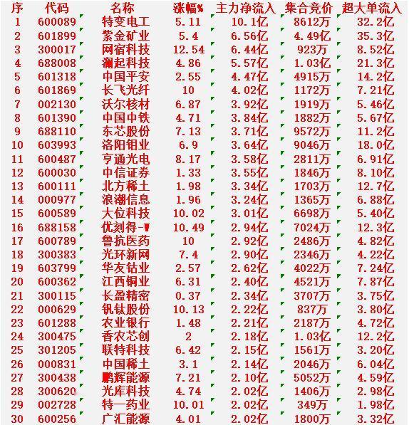 1月26日开盘45分钟,主力资金“买入的 ”的30名单一览! 特变电工:净流入 10.1亿元 紫金矿业:净流入 6.56亿元 网宿科技:净流入 6.44亿元 澜起科技:净流入 5.57亿元 中国平安:净流入 4.47亿元