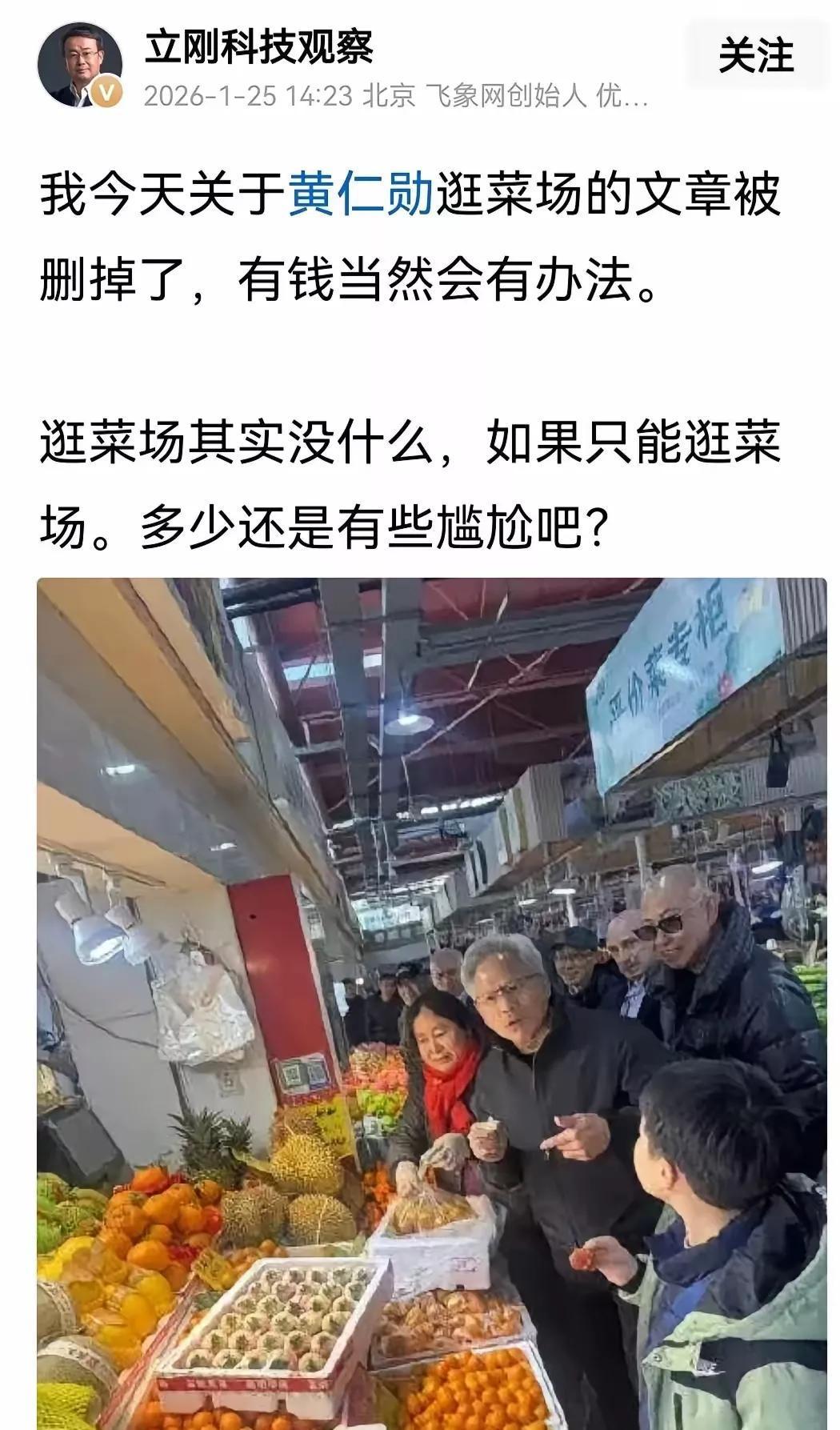 项立刚说黄仁勋花钱删他文章(下图)。 原来项立刚这么牛,连AⅠ教父都怕他,盯着他在互联网上的一举一动。 我早就说过,一个人会被自己树立的人设洗脑的。比如一些当权者天天雇人吹自己,结果真的以为自己就是那样的人了。 项立刚长年累月自我吹捧,马斯克的专业水平都在他眼里一文不值。现在又信心十足地敲打黄仁勋。天下之大,已经难以找到自己的位置了。 语言粗鄙点也就算了,个子矮点也不是罪过,但自己还是要掂量一下自己,马斯克黄仁勋这类人也会怕你?